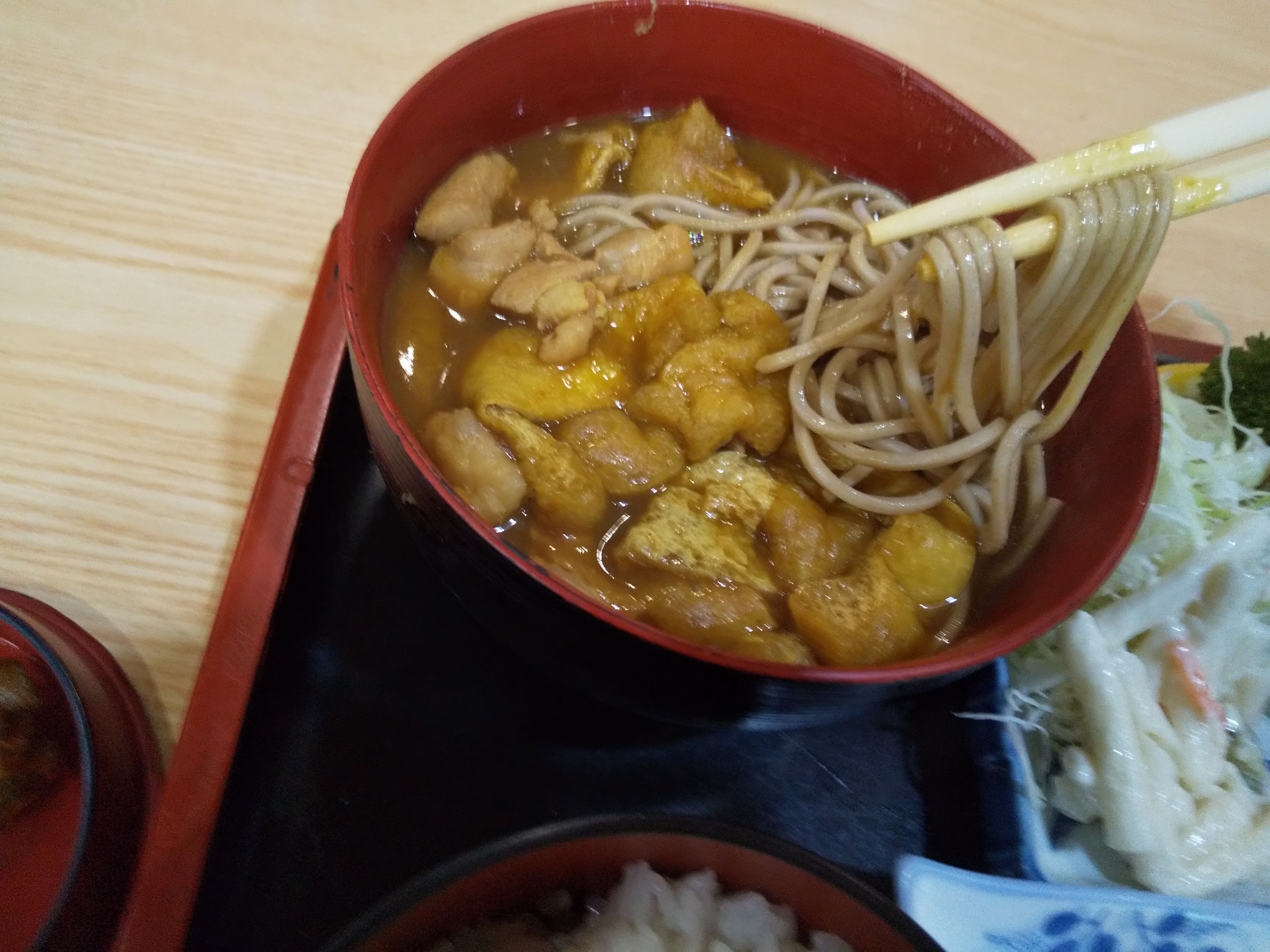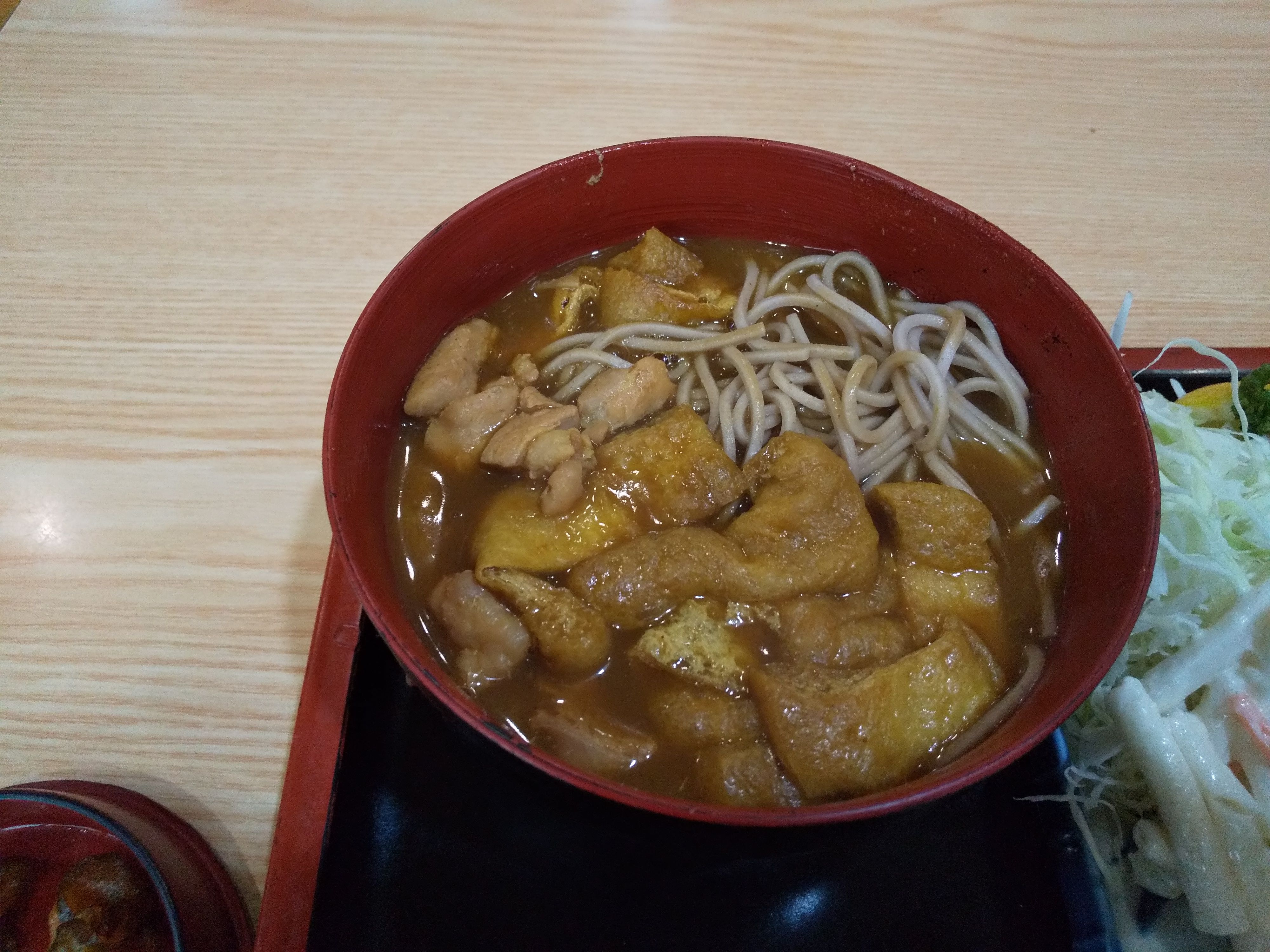 カレーそばは乾麺っぽい。油揚げもたっぷり。