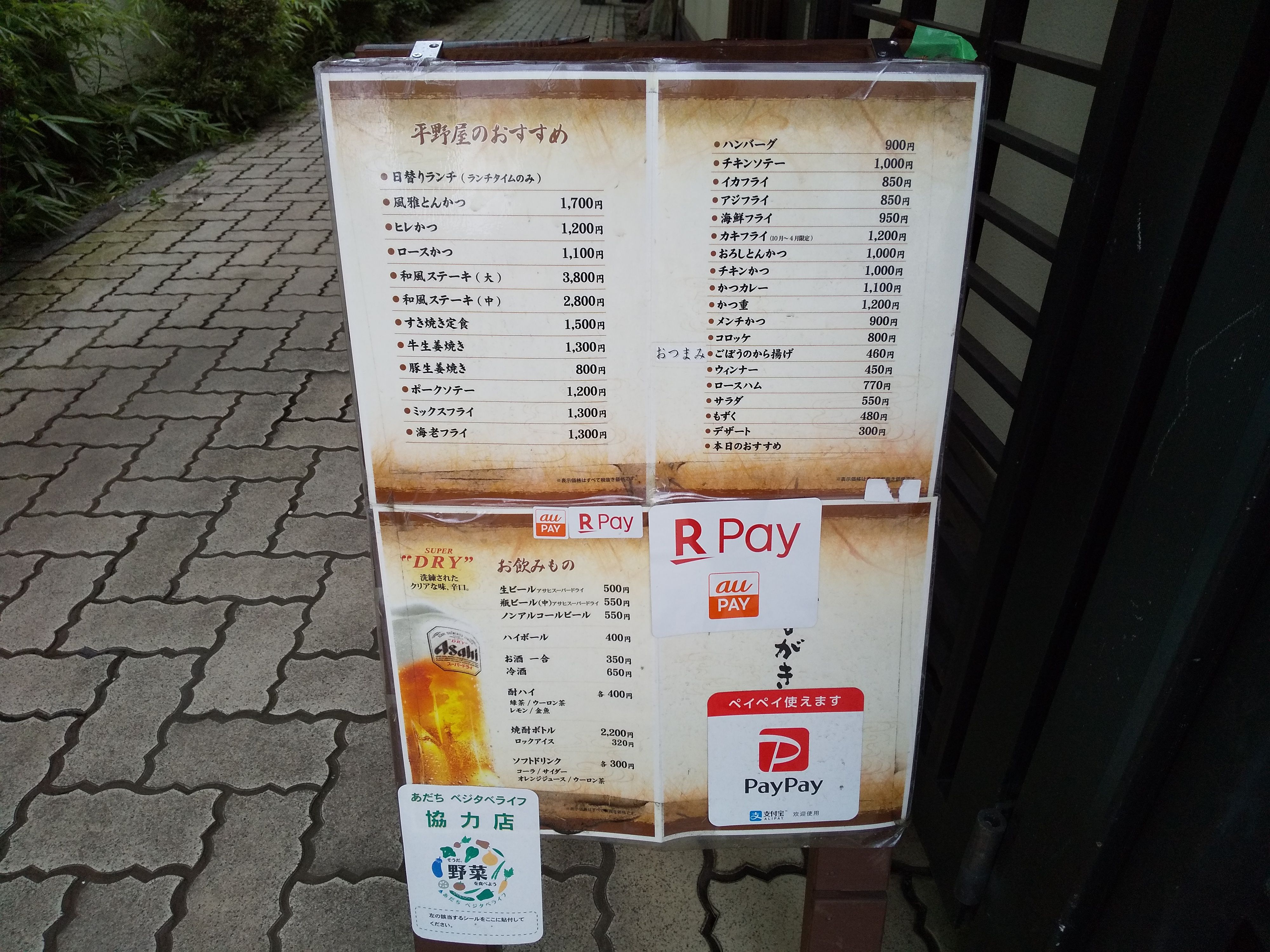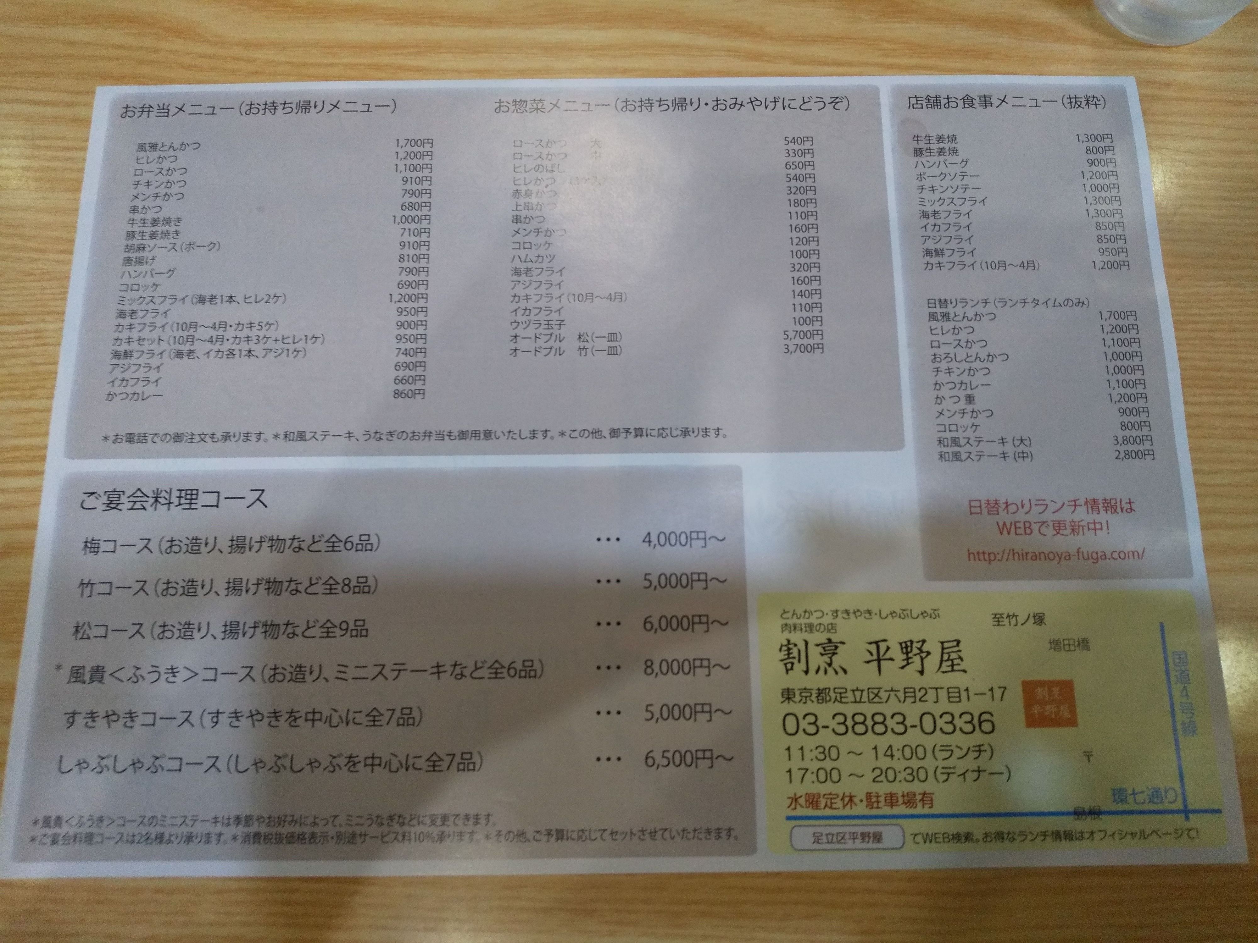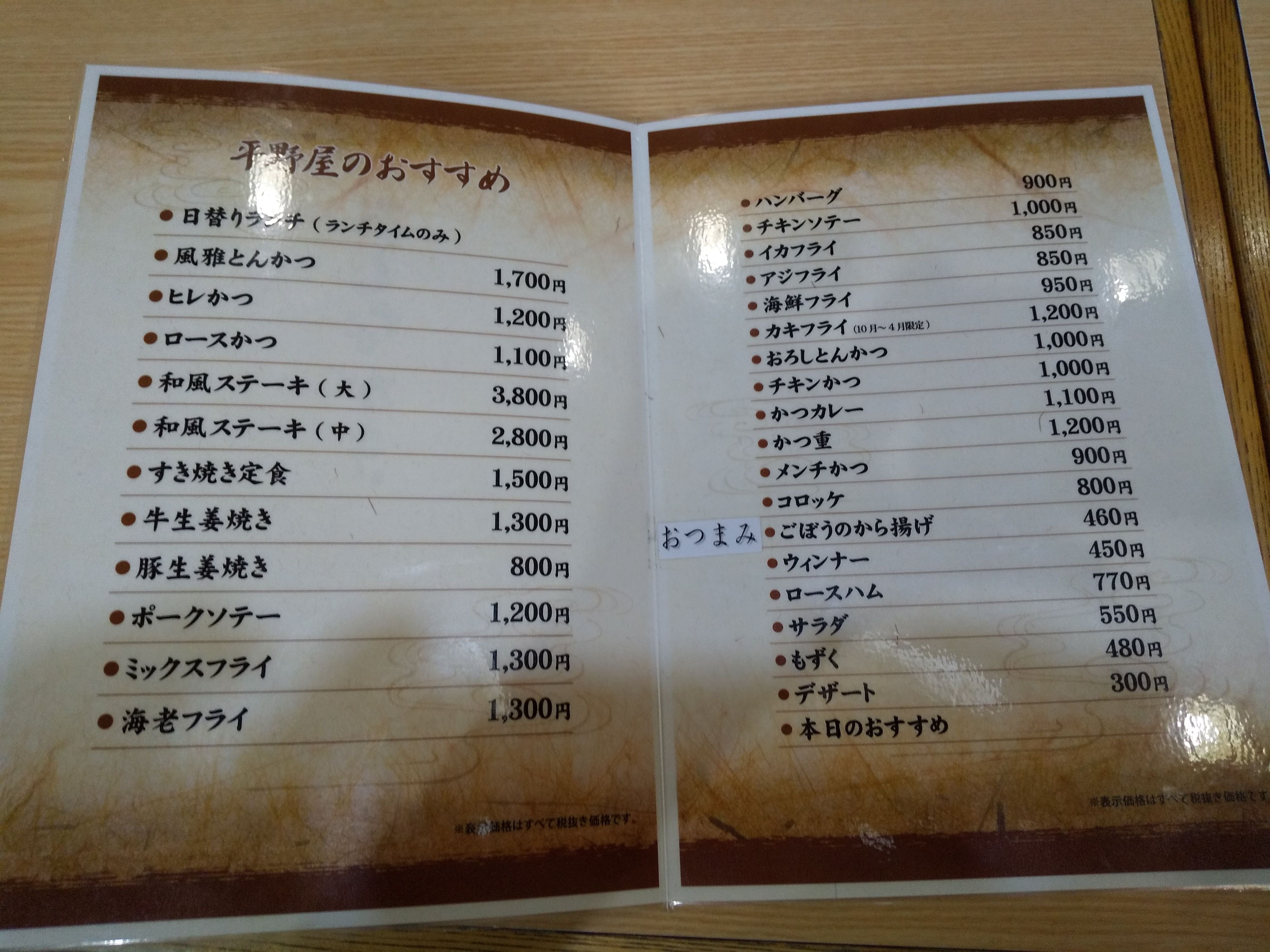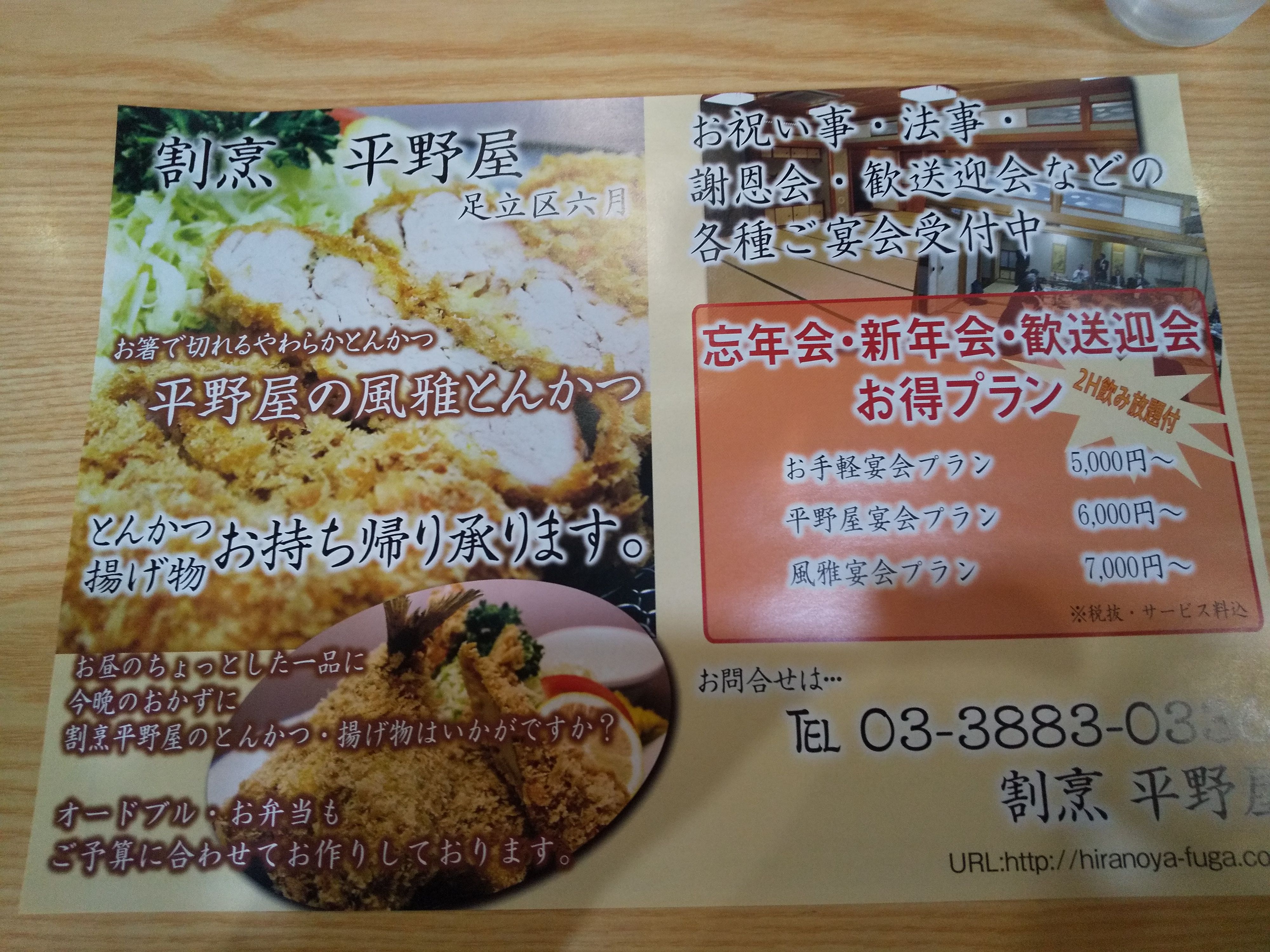 ” 当店平野屋は足立区の老舗割烹、とんかつ、しゃぶしゃぶ、肉料理の店として、長らく営業を続けて参りました。 いつの時代にも「親しみやすい日本料理店」の雰囲気を大切に、お料理も 旬の素材を吟味し、一生懸命調理しております。” とのこと。
