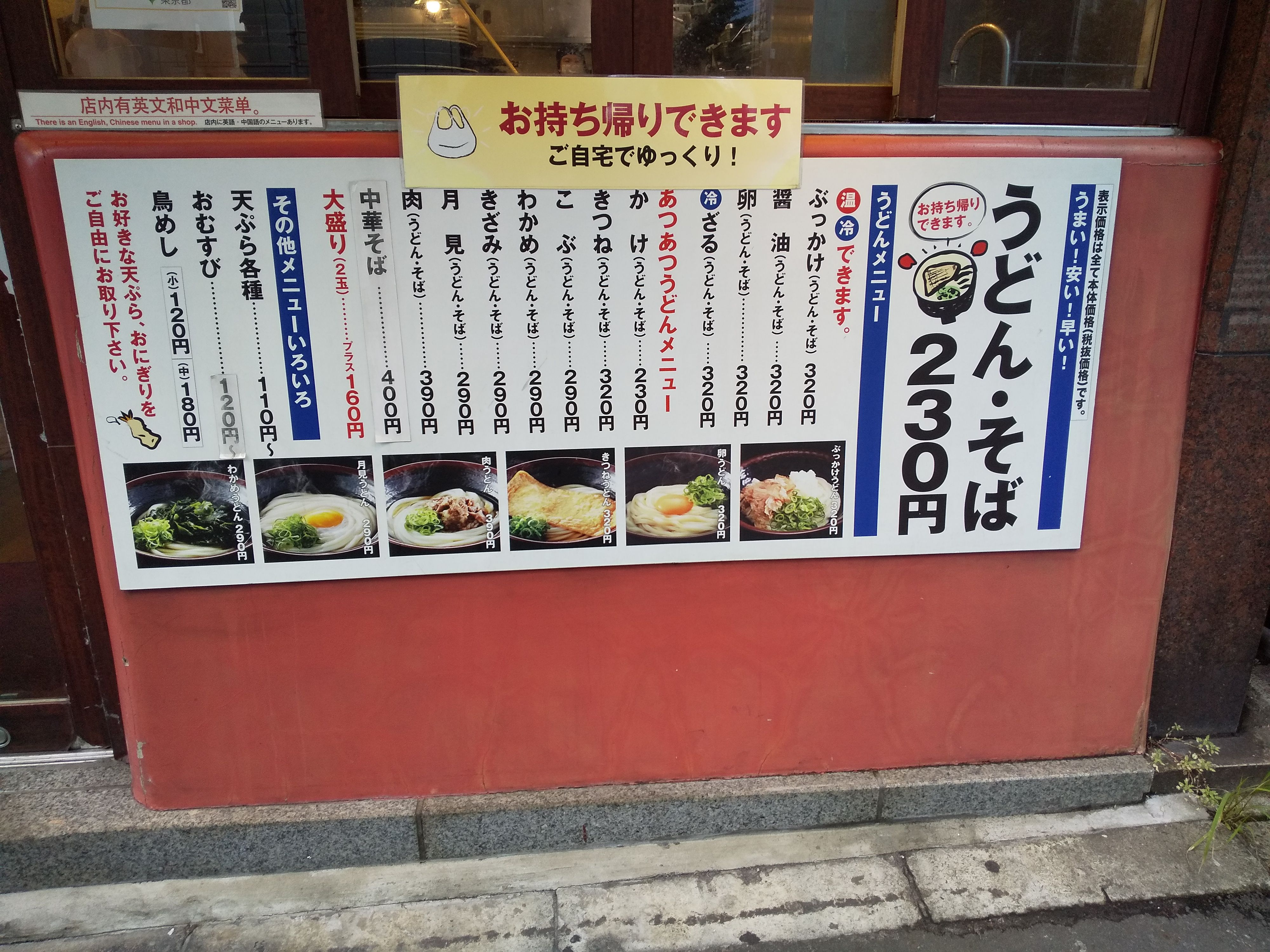 店頭メニュー。関西だと違う場合もあるが、そば・うどん同値段。