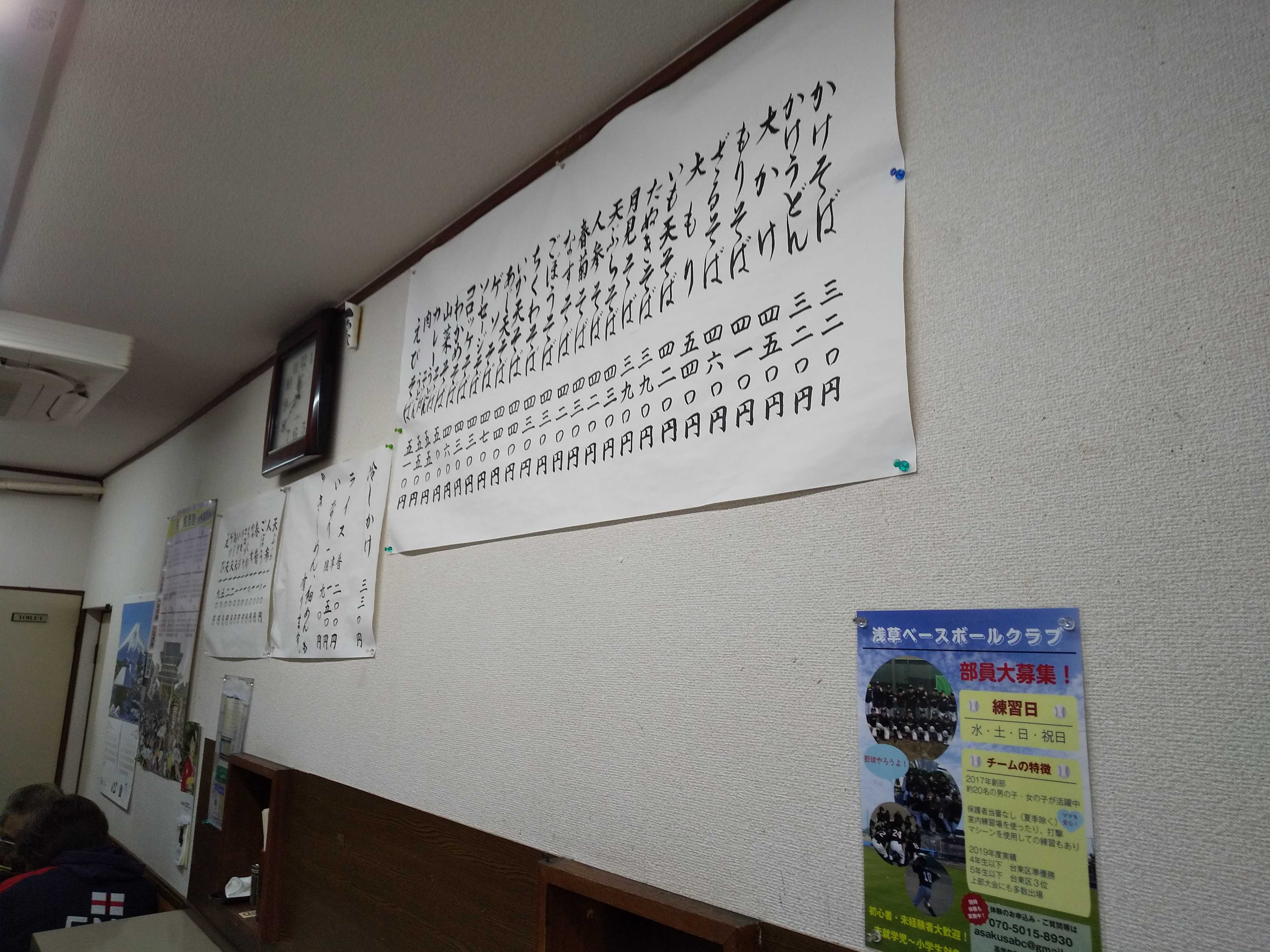 混んで厨房向きカウンター席が埋まっていたので壁向きカウンター席を確保。壁メニュー。