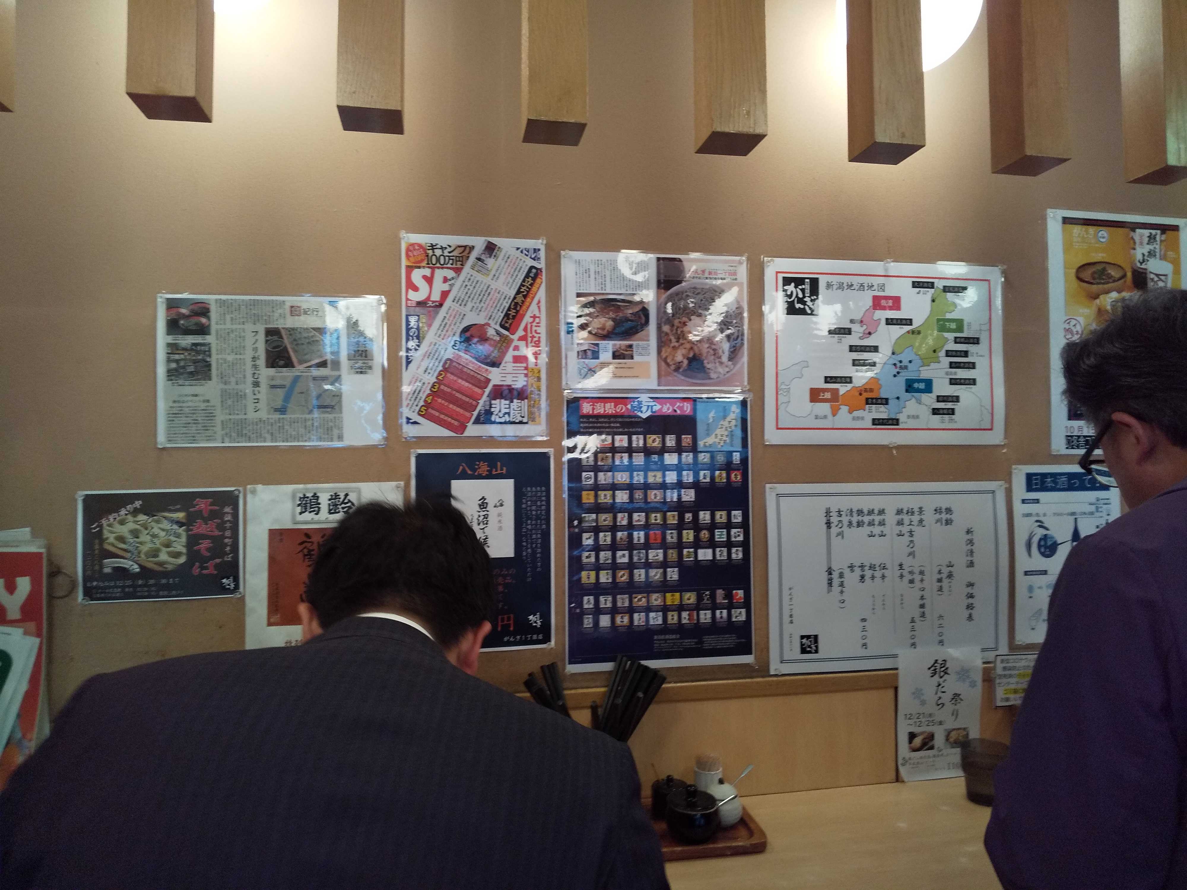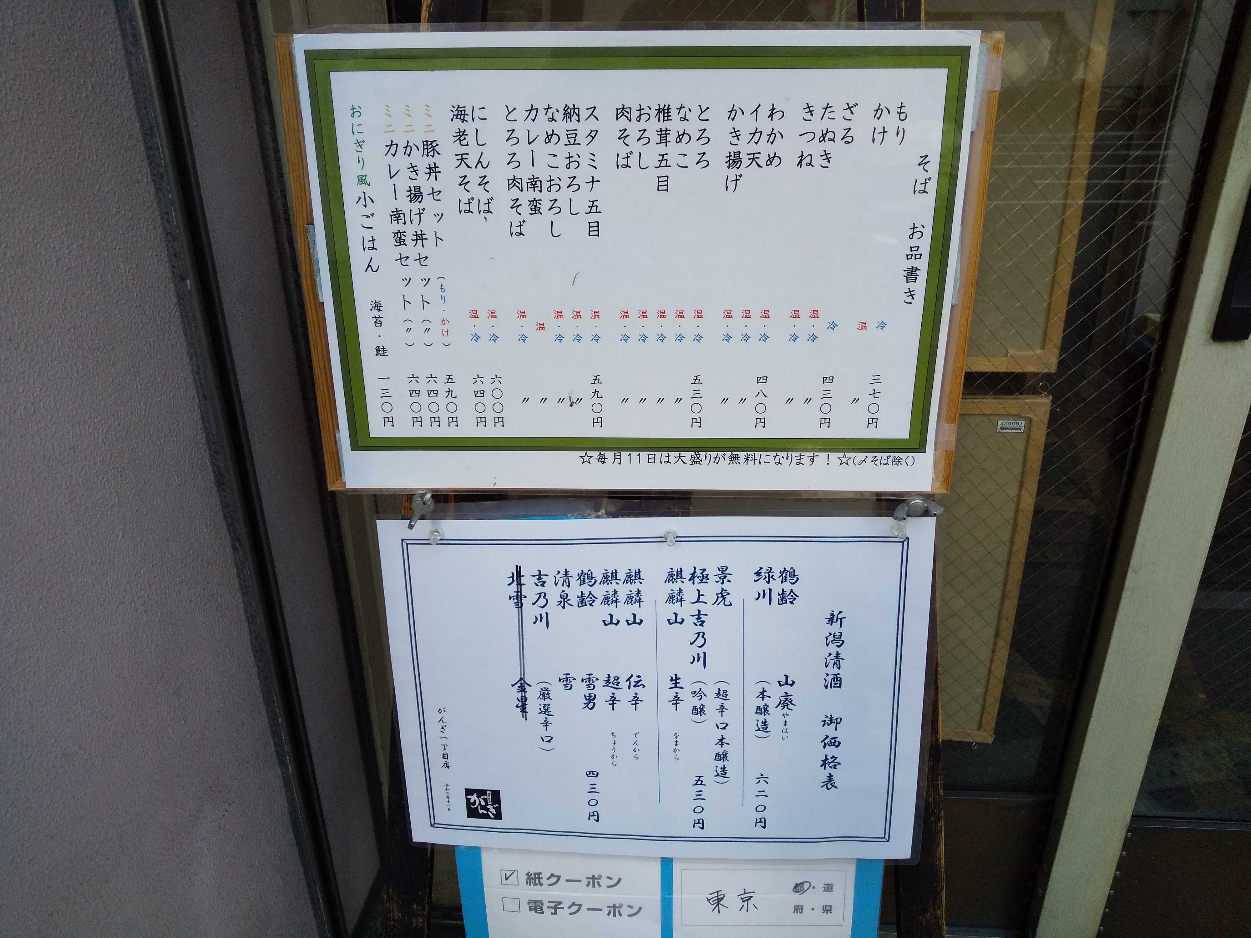 昼間は立ち食いそば、夜は立ち飲み営業。海藻が練り込まれた独特の歯応えと香りのする越後のへぎそばが食べられる人気店。お酒の種類も豊富で、季節に応じて色々なフェアもやっている。