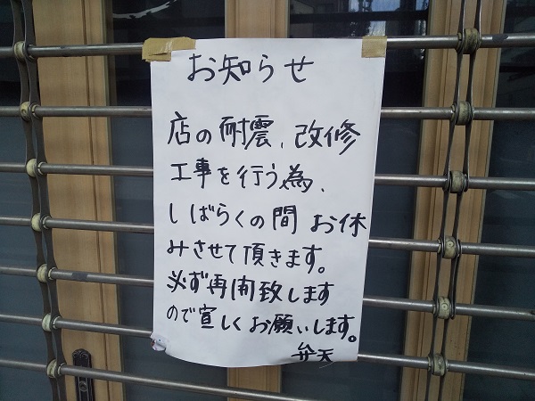 ・店の耐震、改修工事を行うために休業中