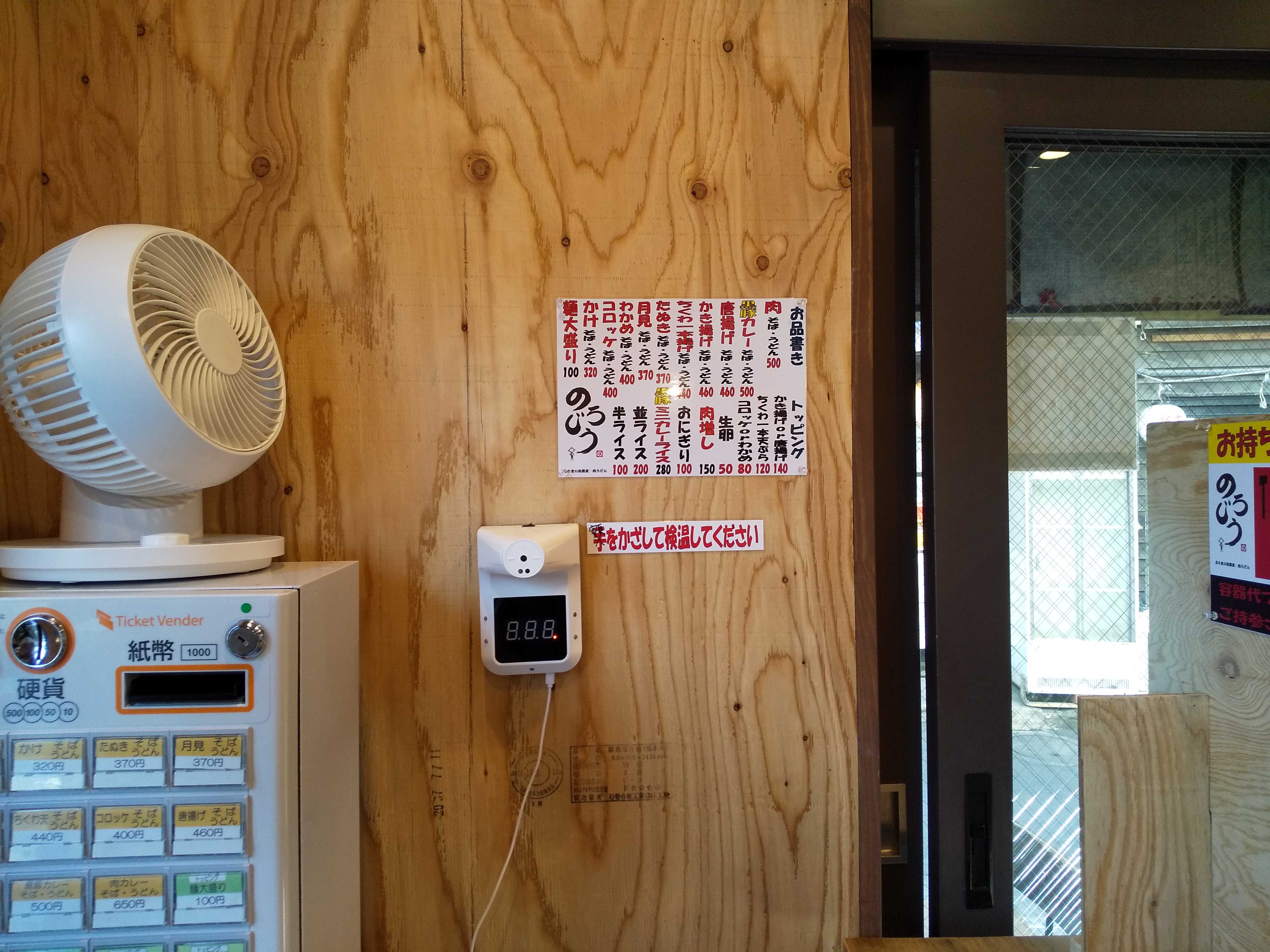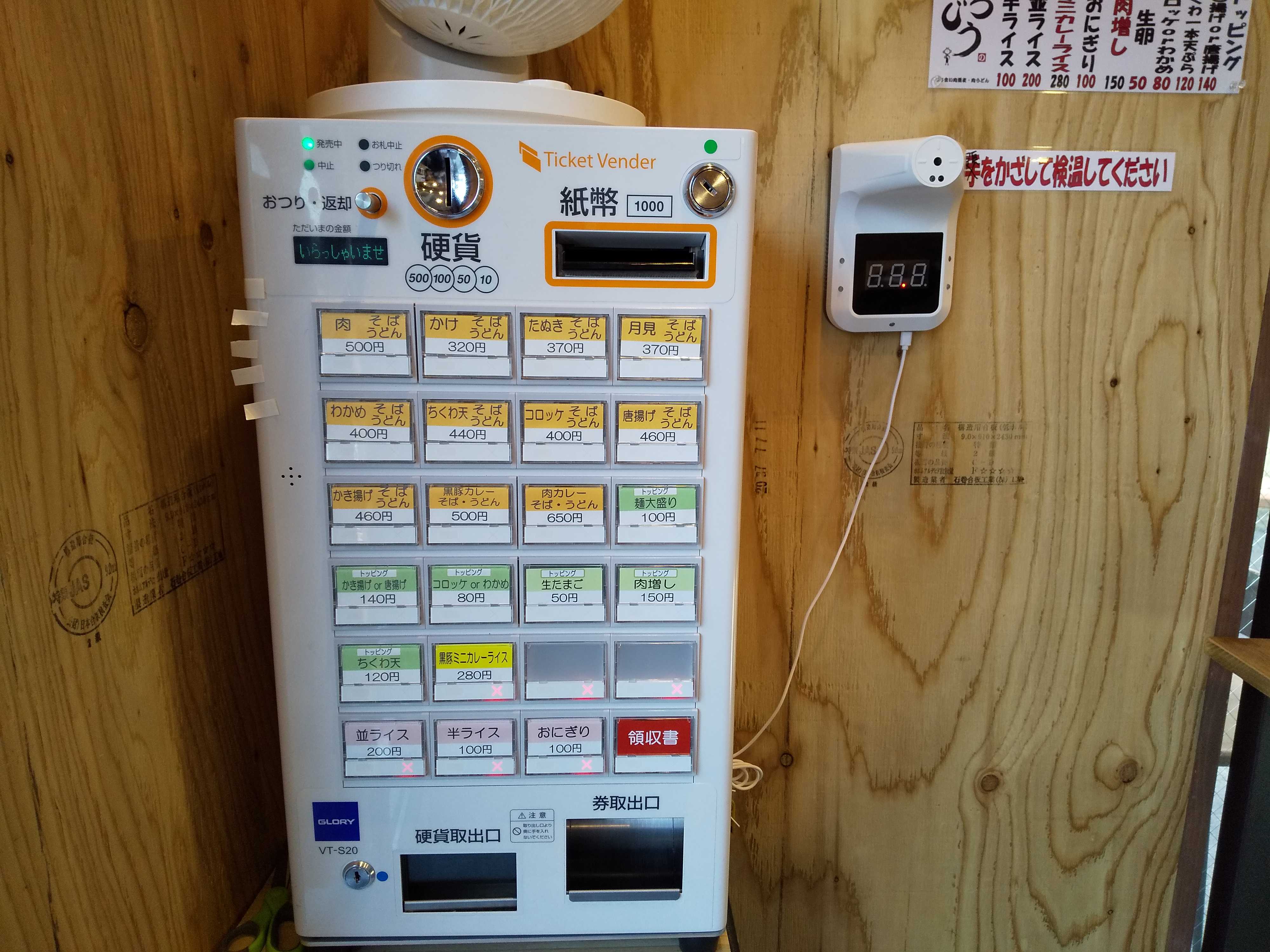 券売機横にもメニュー。立ち食いそば屋では珍しい検温器あり。