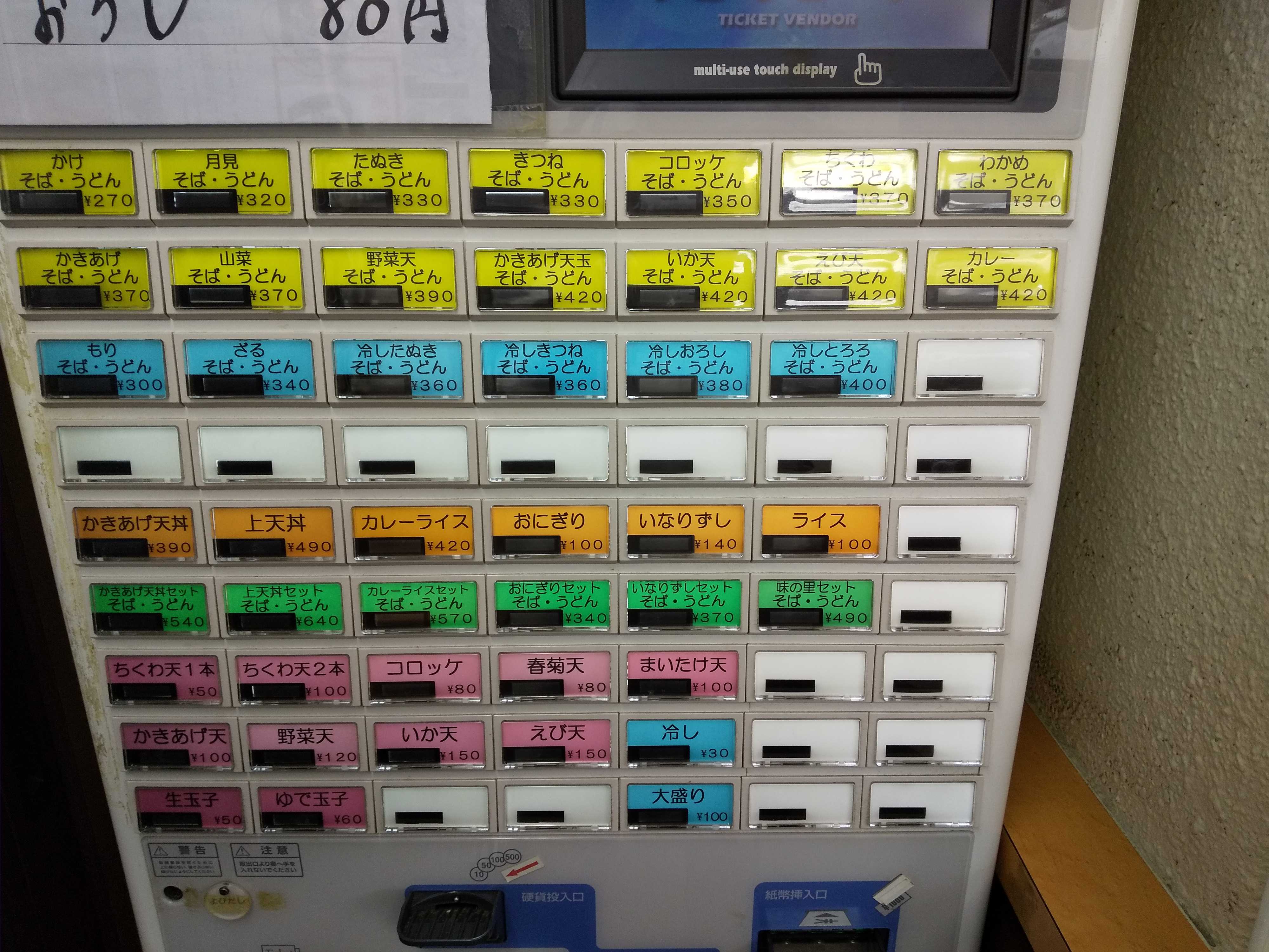 券売機。3か月半前と同じく貼り出されてていた「とろろ」と「おろし」は今回も興味なく、入店時に天ぷらケースに現在品薄状態の春菊天があるのがわかったので、食券を2枚求める。