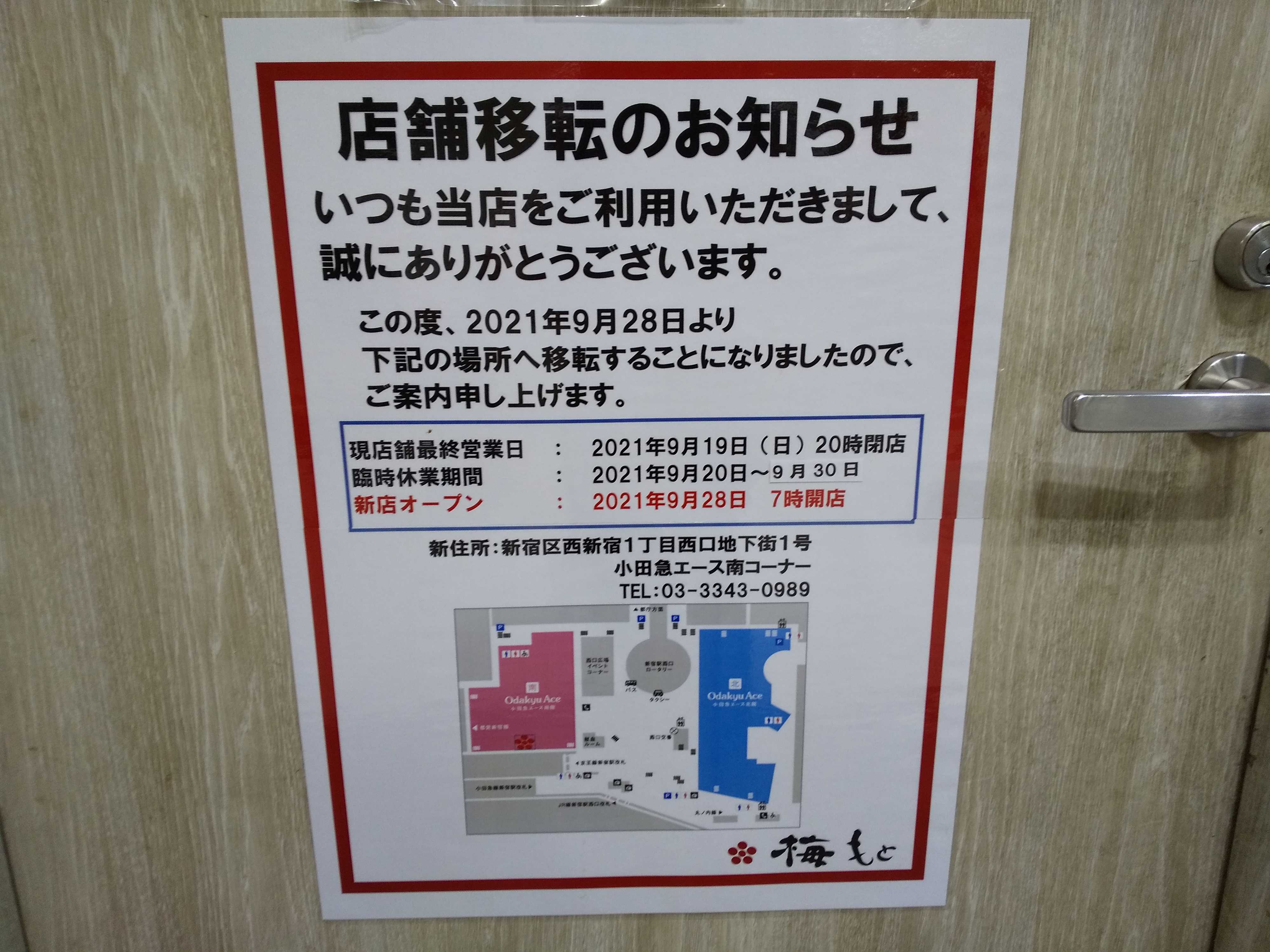 会社のホームページだと移転前店と同じ【梅もと 新宿西口店】になっているが、小田急エースのページや【ちよだ鮨】による求人情報だと店名が