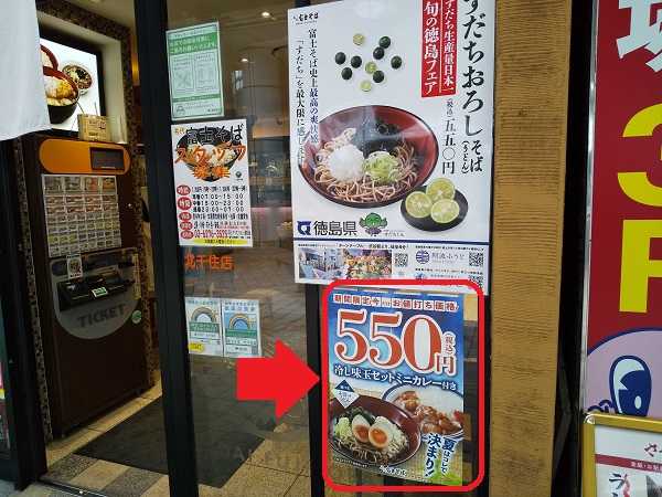 店頭  全店展開中の『すだちおろしそば』は1日に 北千住東口店で食べている