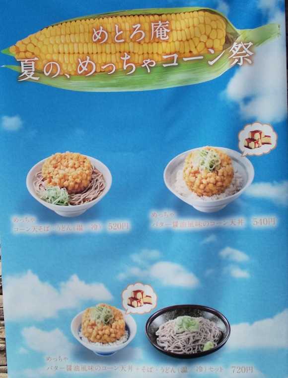 『めっちゃコーン天そば・うどん(温/冷)』『めっちゃバター醤油風味のコーン天丼』『めっちゃバター醤油風味のコーン天丼+そば・うどん(温/冷)セット』の3つの商品がある。