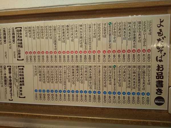 お品書き。左にもっとある。私の地元・足立区の【雑賀屋本店】さんが「日本一メニューが多い立ち食いそば屋」を謳っているが、【よもだそば】さんのほうが多いかもね。