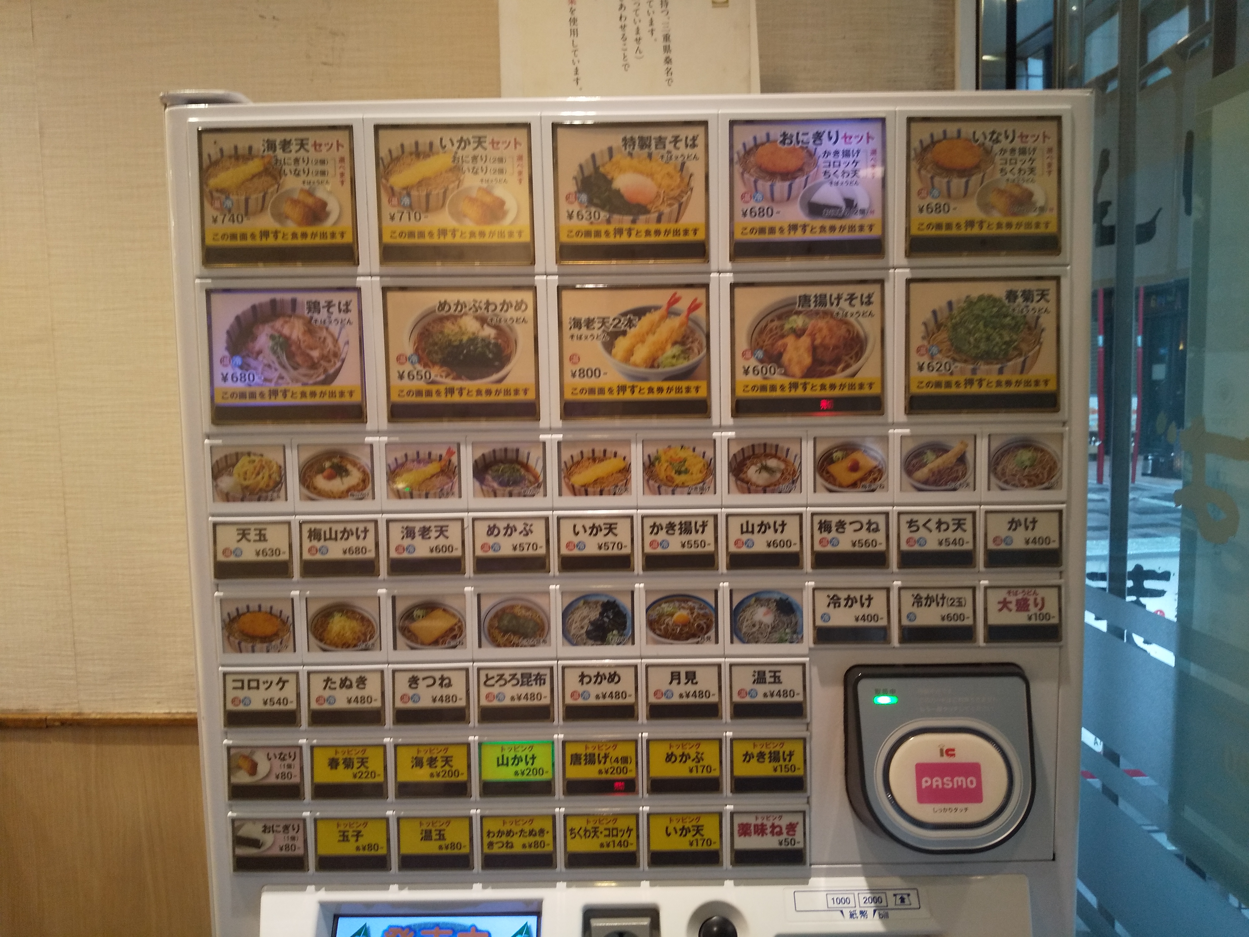 券売機の上に「こだわり」。今でも そば粉は国産なの? 少しでも入っていれば偽りなし、だ。