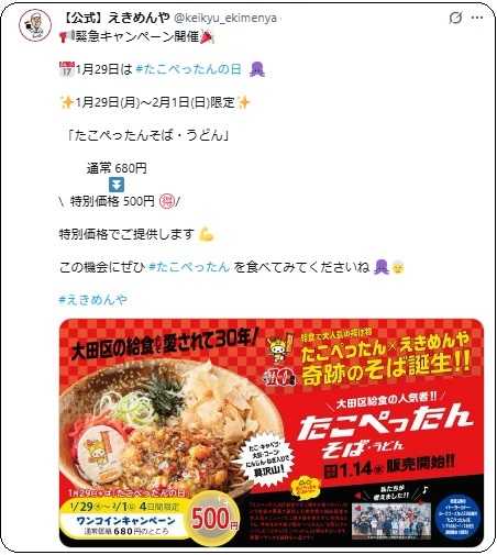 そう、そう、 1月29日が「たこぺったんの日」 なんで、緊急キャンペーンが開催されるね