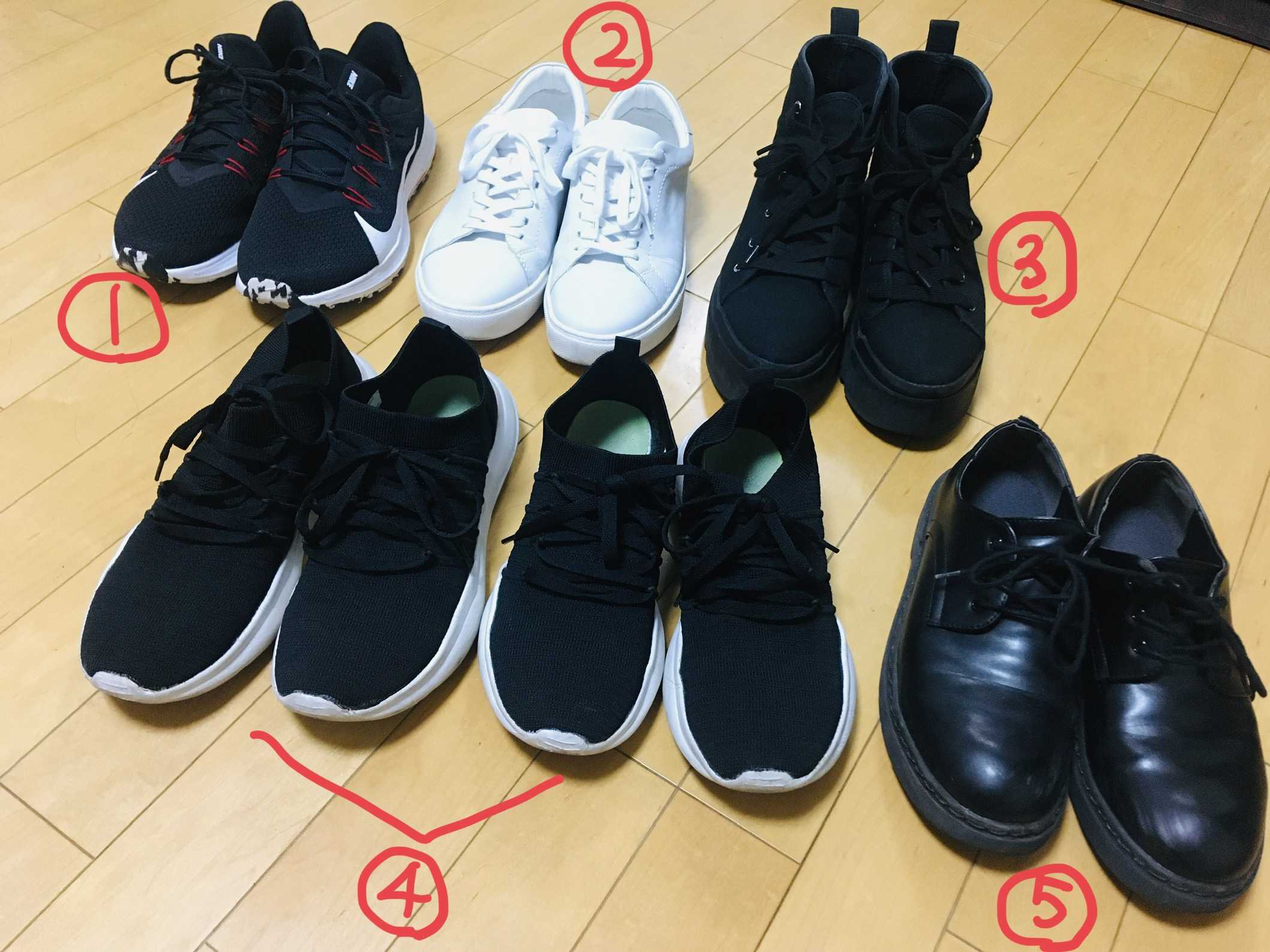 こんばんわ(o^^o)ミニマリストに憧れていて、沢山の記事読んで自分なりに物への考え方を変えた結果少しずつカテゴリーごとに使うものと不要な物に分ける事が出来ました。前回はメイク用品💄でしたが、今回は靴、シューズにしてみました。全部で6足①NIKEスニーカー②GUの本革スニーカー③H&Mの厚底ブーツ④GUのスニーカー⑤ウィゴーのフェイクレザー靴昨日、選別して、予選に落ちた靴は、全て捨てました♪( ^∀^)捨てた靴は、パンプス3足、スニーカー2足、サンダル1足の合計6足捨てました♪仕事用は④⑤です。