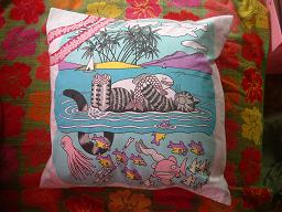 私のの思い出Tシャツを、ウイラニのチエコちゃんがクッションカバーに作り変えてくれました。しかも、こんなにかわいく!クレイジーシャツも最近はネコ柄が少なくなって、何か寂しさを感じるこの頃、FITくんと子犬さんとふらっと実家へ寄ったときに、実家の父に『部屋のTシャツをもって帰らなければ捨てる』と何故か今頃脅迫されて、この一枚をチエコちゃんに托したリリcoiでありました。家庭科はすでに小学生のころから『母に作ってもらったものを提出』で済ませていたリリcoiなので、自分で何か作ろうという気持ちは全く無く私のまわりにはチエコちゃんをはじめ何故か手先の器用な職人さんがたくさんいらっしゃるのです。チエコちゃん、本当にありがとう♪大切にしますね。