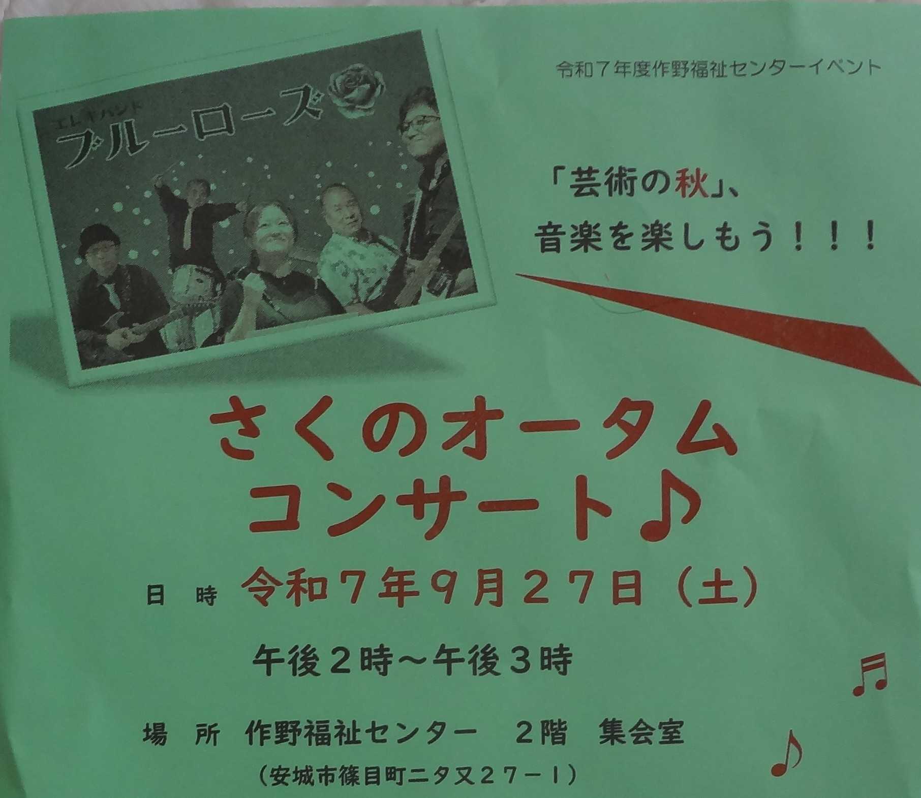 昨日の午前中は「作野福祉センター」での「ベンチャーズ」の曲を弾くのだからきっと「エレキグループ」だろうと思いましたグループの名前は「ブルーローズ」初めて遭遇しました用意された「40席」はあっという間に埋まり「5席」追加されました演奏してくれた曲は、初めに「ベンチャーズ」の曲を3曲1 ダイヤモンドヘッド2 パイプライン3 10番街の殺人 ここから昭和歌謡4 京都の恋5 ブルーシャトー~ブルー・コメッツの曲です6 君に会いたい~ジャガーズの曲です7 雨の御堂筋8 真っ赤な太陽9 二人の銀座10 サボテンの花(財津一郎の曲)11 2億4000万の瞳(郷ひろみ) 手拍子が始まり最後はこぶしを突き上げて、と 参加者45名中、20名位がノッテきました (もちろん参加者は全員65歳以上です)12 霧のカレリア(カクジイの大好きな曲です) ※「スプートニクス」というエレキグループの曲です13 夜空の星(加山雄三)14 君といつまでも( 同 ) 編曲が素晴らしかったです。 元々「エレキ」の曲に思えたくらい 哀愁をおびて良かったです15 ブラックサンドビーチ16 津軽じょんがら節 昔「寺内タケシ」が初めて津軽三味線の この曲をエレキギターで弾いて大評判になりました17 青春時代 みんなで一緒に歌いましたあっと言う間の1時間半でした20年振りに「生のエレキの演奏」を聴けてすっごく嬉しかったです参加者45名の内「女性」が37名平均年齢は、恐らく「75~80」だと思いますしかし、皆さん、ホントにお若いです