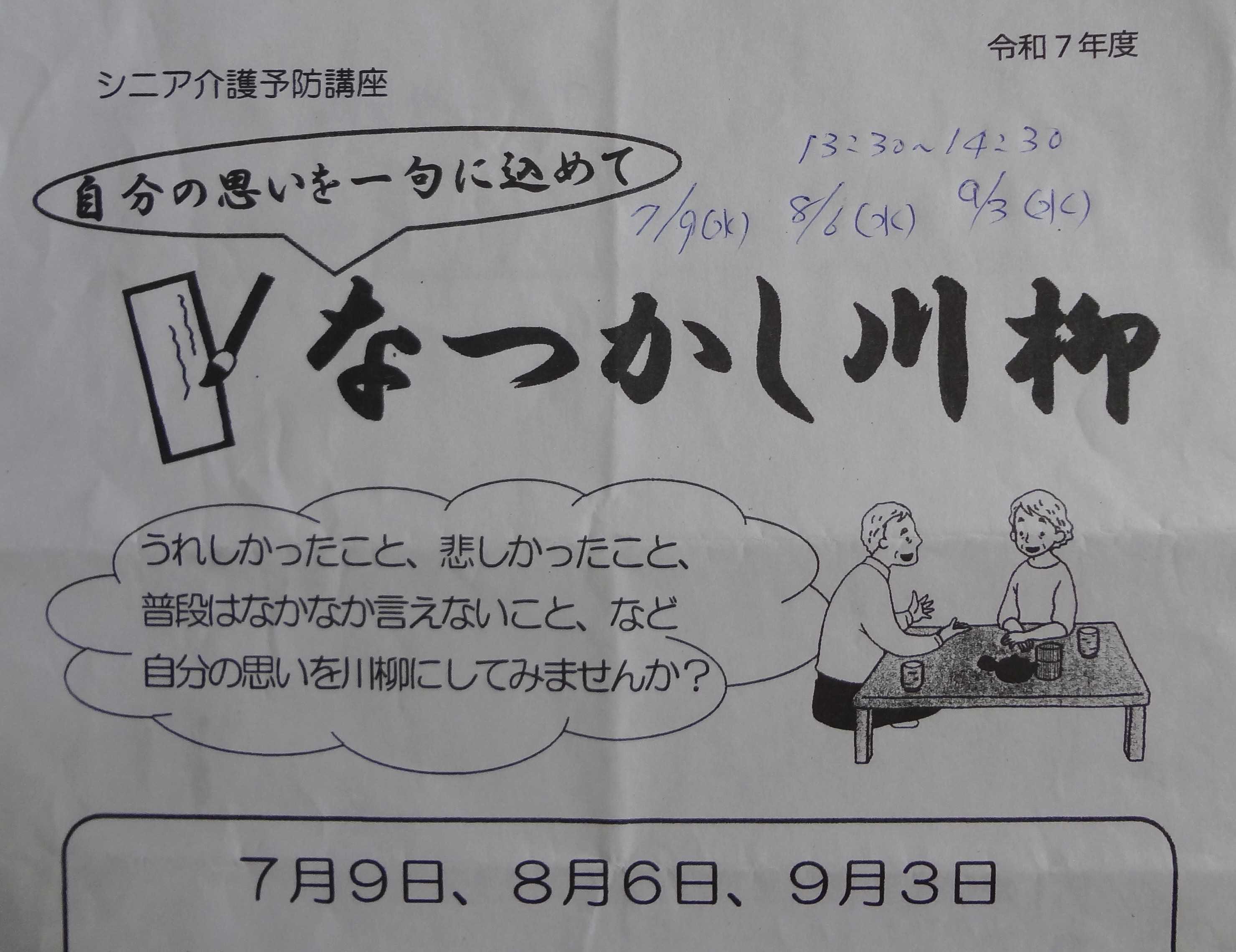 昨年も3回開かれて好評だったらしく今年も「川柳教室」が開催されましたカクジイは昨年も参加しました講師は「元国語講師(小中学校)」ですなぜか「シニア介護予防講座」になってます参加者は「9名(男3女6)」です今週の水曜日、9月3日が最後の日です「宿題のお題」は「祭り」でしたが自由に詠んでもいい、となりましたカクジイは「祭り」で5句、詠みました1 大人神輿 担ぎたかった 中三の夏2 ひなまつり 呼んでくれた 北野さん3 ちょっとだけ 担いだあくる日 肩真っ赤4 祭りの日 いつもより多い お小遣い5 仏壇の 20円盗んで 金魚すくい「自由」の分で「川柳のらりくらり」に投稿した2句を披露しようと思ってますお題は「待合室」1 遅れたね5分 帰るからマユミ2 また遅刻 俺たち終わりだ ふざけんな講師と参加者の反応が楽しみです