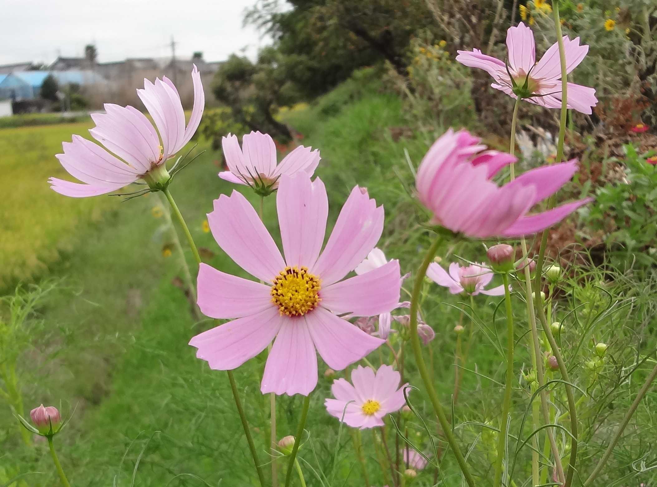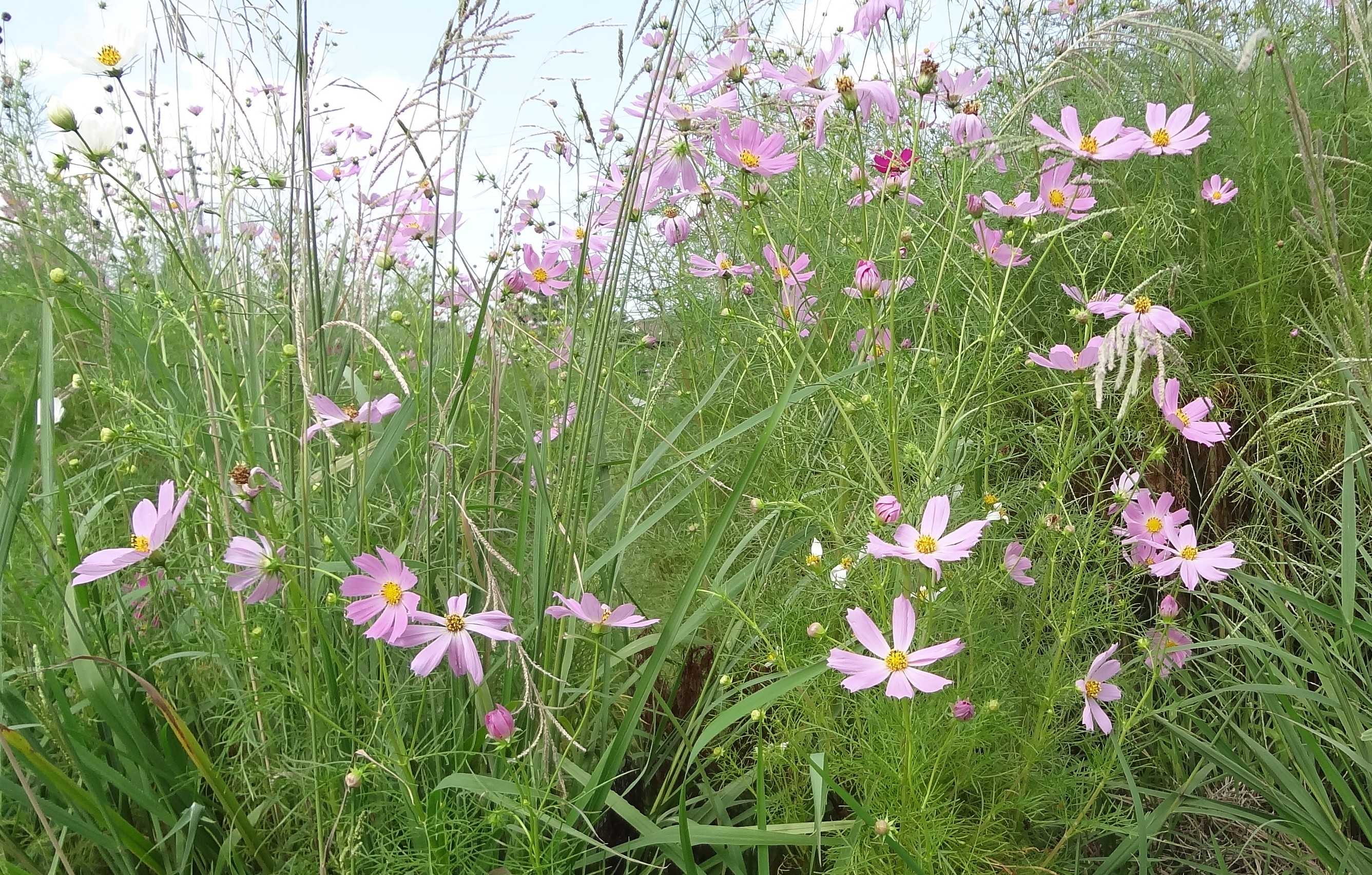 「彼岸花」には負けないわよ、と「コスモス」が一斉に咲き出しました 「コスモスの後ろ姿」です