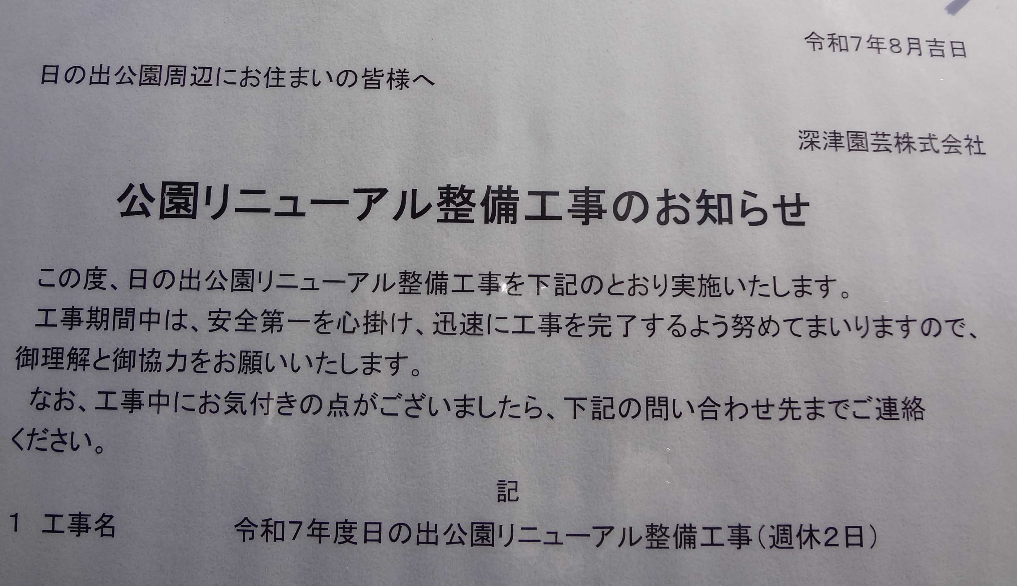 安城市・三大桜祭り会場の「日の出公園」がリニューアル工事開始でした写真を撮っていたら「公園緑地課」の職員が寄って来ましたので、いろいろ伺いました「ここは市内で最も古い公園で、小学3,4年までの子や赤ちゃんを連れたお母さんたちに来て欲しいのでかなり変わると思います」「桜の木や藤棚はどうするんですか?」「周囲に咲いている桜は一部残します 藤棚は撤去します。 大きな子供が楽しめる遊具を置く予定です」「失礼ですが、ここのトイレ古くて汚いですよね」「はい、おっしゃる通りです、きれいにします」 工事は「9月~来年2月」の半年もかかるようですが、来年4月の「桜まつり」は例年通り楽しめそうです