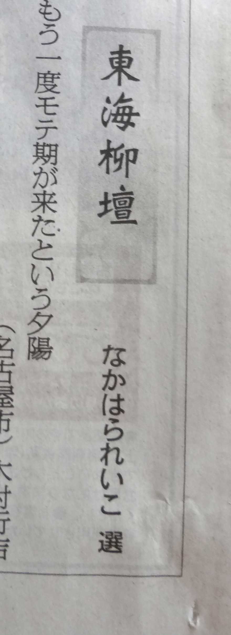 先日、紹介させていただきました「朝日新聞・東海柳壇」に応募しました「ハガキ一通に3句まで」だったので「3句」詠んで応募しました1 あれ?どうしたの 昭和百年の 祭りなし2 食べてない 言い張る婆ちゃんを スマホ撮り3 L・M・S 大・中・小だと 品がない