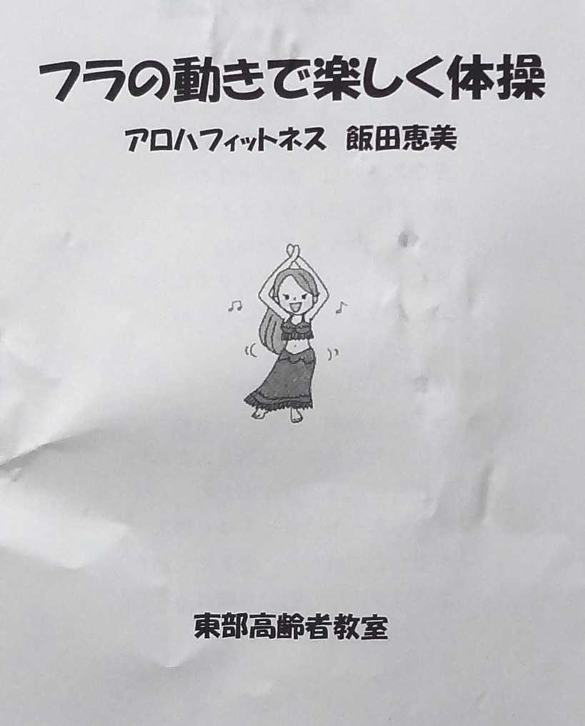 昨日は「東部高齢者教室」に参加して来ました安城市は小学校区に在る各地区公民館と中学校区に在る「各地区福祉センター」で毎年「高齢者教室」を開催しています内容はそれぞれですカクジイの暮らす東部学区では「東部公民館」で毎年行われます今年の内容は5月29日 開講式・絵解き「地獄絵」講師:養寿寺住職 畔柳優世6月12日 落語:微笑亭三太6月26日 防犯l講話:愛知県警察防犯活動チーム7月10日 マリンバ演奏と若返りリトミック :マリンバ奏者 川野佳代9月4日 歌って、楽しく、元気に :シンガーソングライター:杉浦美和9月18日 フラの動きで楽しく体操 :アロハフィットネス:飯田恵美10月9日 民謡ふるさと紀行~心に響く津軽三味線にのせて :渡辺民謡会、渡辺傅次郎10月16日 介護予防イキイキ体操:スタジオDO代表:高橋千恵子 閉講式毎回9時半~11時の「1時間半」で行われます東部学区10町内会から、高齢者がやって来ます毎回80~90名が来ますよ10月で終わってしまうのは11月に「東部地域ふれあいまつり」12月に「東部芸能まつり」があるからだと思います昨日の「フラの動きで楽しく体操」は少し疲れましたその内容は明日のブログで