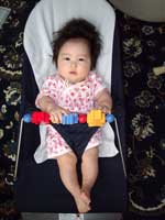 昨日、高島屋にてベビービョルンのべビッシッター1,2,3(バウンサー)を購入しました。お店で娘を乗せてユラユラ具合を確認してご機嫌な娘の顔♪、即買い!パパは高いな~と一言・・・。ママは赤ちゃんの物にはお財布の紐がゆるんでしまって・・・・。色はシティブルー。紺色です。ちなみに写真はタオルを引いています。実は金曜日に1歳児の女の子のお宅でたこ焼きパーティをしまして、4人プラス子供達4人が集まりました!娘以外はみな1歳児!楽しかったですよー。たこ焼きも美味しかったですし、ワイワイして。1歳ってこんな遊びができるんだーとなんだか楽しみになってきちゃいました!そのお宅で、ベビービョルンのベビーシッターを使わせてもらったら、娘は適度な揺ら揺らが心地よいようでご機嫌でした!バウンサーは買う予定は全くなかったのですが、こんなに良いものならと即日購入しちゃいました。ほとんど衝動買いです。エヘッ。今朝もご機嫌でついている木製のクマをクルクル回して、ご機嫌にゆらゆら~♪バウンサーってこんなに素敵なものならもっと早く購入すれば良かったな~。新生児から使用できたのに・・・・。4ヶ月からでも活躍しそうなアイテムです!