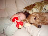 早くも4ヶ月近く犬と過ごしてきた愛娘です。まだ犬なんだか、人間なのだかわかっていないのかな??でも愛娘はルイのことはちょっと苦手のよう。ルイは娘の口の周りについている母乳をなめたくて、狙っている時があります。大抵は拭いてしまうのでなめたりしないのですが・・・・。先日ちょっとママがキッチンでガーゼを洗っていた隙に、ソファにいた娘の口のまわりをなめていたのです!!もちろん一喝しましたよー。ソファーの上は危険エリアです。もちろん床になんて寝かせられません。我が家は畳の部屋もないので、座布団の上にコロンなんてことは滅多にしていないのですが。そろそろ寝返りの前の横向きが出来るので、ハイ&ローチェアやソファの置いとくのも怖いこの頃。絨毯にコロンとさせたら、ルイが近づいてくること間違いないかな?絶対間違いない!犬との暮らしはなかなか大変ですが、ほのぼのすることも多いかもしれません。普段は仲良し?!だと思います。こんなにくっついていることもあるのですよ!娘が成長したらルイの方が逃げるかも!!尻尾ひっぱらないで~と(笑)最近のお気に入りのガラガラを握って満足顔!