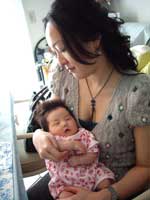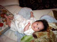 一人で「あーあーうーーえあーえああー」などと赤ちゃん語炸裂でずーと話していることが多くなりました。3ヶ月半、クーイングで絶好調です!いつくらいからバブリングはいつから始まるのかな?楽しみです。ママが相手をすると更にハイテンションになります!でも何故かパパとのおしゃべりのほうが楽しいみたいです。ちょっと嫉妬~(笑)接する時間短いから密度が濃いのかな??この頃は本当に会話するのが楽しい様子でニコニコしながら色々言っています。もちろん何を言っているかなんて全く理解不能ですが、なんとなくこんなこと言っているのかな?と勝手に解釈しています。「あーあーあああー」とあーばっかりの時はママを探して呼んでいるような?!どこにいるのよーと必死の様子なのかも。「あーうーえーうーああえー」などバリエーションがあるときは楽しい会話?!かも。ちょっとトイレや洗濯物を干しに行ってそばを離れると、探す声を出している感じで、ほっとかれる時間が長くなってくると段々泣き声がまじり、やっぱり最後は泣いちゃいます。トイレもゆっくり行けません(笑)ここ最近は、普通に会話を交わすようにしています。「今日はいい天気だね~」「おいしいね~」「待っててね!」と。ちょっと前までは「あ~う~」と答えることもあったのですが、言葉を吸収している?!と思ったらちゃんと会話しよう!と急に思ったわけです。時々「0歳からの優しい英語の歌」というのもかけて、一緒に歌ってみたりしています。ママの作詞作曲オリジナルの子守唄は毎日聞いているので、覚えているみたいです。ニコニコして時々一緒に歌ってくれます。もちろん「あーーあーーううー」ですが。パパとの会話もママが話している言葉もすでに赤ちゃんの脳にインプットされ始めているのかしら??なるべく汚い言葉使いはしないように心がけなくちゃ・・・。でもついついいけない言葉を言っているですよねー。いけないいけない。今日夕方突然、また従兄弟のお兄ちゃんが訪ねてきました!雨で寒いのに何故?下北沢でお芝居があるので、ついでに寄ってくれたみたい。ほんの30分の滞在でした。2ヶ月ぶりのご対面!首がすわったので安心して抱っこしてくれました。女の子っぽい顔になったね~だって!いつも予告なしに来るので、毎回ドッキリです。次はいつかな?お土産に餃子!とケーキを買ってきてくれました。おかずって嬉しいですね!!赤ちゃんがいると作るの大変ですもの!