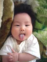 お指しゃぶりのブームがさったこの頃、次のブームは舌を「ベー」と出すことのようです。口の周り、襟をビチョビチョにしながら舌を出してとっても満足顔。舌を出すようになったのはここ1週間くらいのことで、それまではずーと指をしゃぶっていました。毎日少しずつ色んなことが出来るようになって行くので、成長が本当に楽しみです。首が完全にすわって、お座りも段々上手にバランスがとれるようになってきました。が、まだまだ前に倒れちゃいます。授乳の回数も減って、1回の飲む量が増えているのかな~?最近、泣く回数もぐっと減ってきたように思います。次のブームはなんだろうな~。