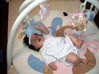 やっとプレイマットに吊る下がっている人形を触ることができるようになり、とっても楽しく一人遊びができるようになりました。パパとママのお気に入りのプレイマットは「ヌーキーズ」シリーズです。妊婦の時、色使いの可愛さにベビーザラスで衝動買いしました。ベッドのメリーも同じシリーズです。前はまったく無反応でマットに転がっているだけだったのに、一生懸命手を伸ばして引っ張ってみたり、動かしてみたりと楽しくやっています。たまにご機嫌で声を出して、バタバタしていたりと、ママも思わずニコニコしちゃいます。来月にはもっと違うことが出来ているのでしょうね~。寝返りができるようになると、マットについている鏡で自分の顔を眺めてみたりするのかな~。そうそう、昨日やっと美容院にいって髪を15cmばかり切ってきました。妊婦の時依頼4ヶ月ぶりで、相当伸びてしまってなかなか乾かなくなっていたので、思い切って切っちゃいました。美容院に行くのもパパが休みの日でないと行けくて、2時間が限度!もう少し大きくなったら、パーマもかけたいな!!