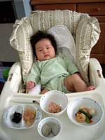 5ヶ月になったし・・・・。そろそろと思いながらも、重い腰がなかなかあがらなかったのですが。先週区で開かれた育児講座にて、離乳食に関して教えてもらったので、離乳食スタートしました。10倍がゆの裏ごしから始めるとのことで、まずご飯を0.5合に水5カップを炊飯器にセットして30分ひたして、おかゆモードでスイッチON!待つこと45分、炊き上がりました。お昼ご飯の時間にトライ!結構沢山出来てしまい、ママが半分食べました(笑)。今日は初日なので、上澄みだけ2口食べさせて?舐めさせてみました。スプーンで1口目。なにやらオッパイとは違うものが珍しいようで、ちゃんと口に入り、人生初のご飯を味わっているみたいでした。なにやらもう少し食べたそうでしたので、スプーンに少しつけて、2口目。得意げに舌を動かして、美味しそうに舐めてくれました。これにはママもパパも感動しました!おっぱいは通常通り沢山飲みました。口をもごもごするなんて、段々成長しているのですね~。おかゆは裏ごしして、1週間分ほど冷凍しました。明日はいよいよ10倍がゆです。食べてくれるかな~。