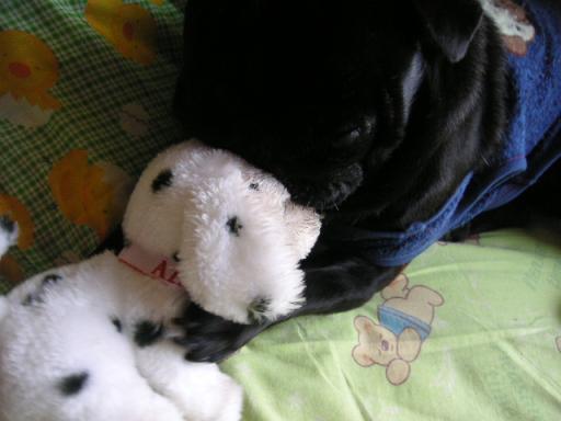 ずっと前からお友達のあすかくんナムルちゃんのお家に行って来ましたあすかくんはパグ♂(8歳) ナムルちゃんはフレブル♀(1歳) のお友達なんです昨年、亡くなった慎之助くん(パグ)との出会いがお友達となるきっかけでした。とても穏やかで頭が良くて可愛くて・・ そんな慎ちゃんを見て私達はパグを飼おうと思ったんです。そして、我が家にてつを迎えました。その時からお世話になり今でも大切なお友達なんです私の携帯にりくのブログを見てくださってる~とメールをいただきました慎ちゃんやあすかくんの着なくなった洋服をりくにくださる~と・・ 嬉しい~(実はここの所、着ていた赤い豹柄の服は前にいただいたモノなんです)早速、お伺いします~とメールをして~ 素敵なお洋服をたくさんいただいて来ました その前に とっても静かなあすかくんです。てつと同じ歳でとっても仲良しでした こんにちは~ ナムルちゃんです この日、会うのは2回目でしたがすぐに仲良くなって こんな風にずっと遊んでいました楽しくて~楽しくて~仕方ない王子のこのお顔はアハハ~ 美味しいお茶をいただいて~ たくさんお話も出来てぇ~ とっても楽しい時間でした。 りく~~ よかったねぇ~ 慎ちゃんやあすかくんの素敵なお洋服をいっぱいもらって。 参加しています。m(_ _)m いつもありがとうございます。 それでは~ いただいたお洋服を見てください~~いっぱいだぁ~ りく王子に着せてみました~わぁ~っ。 素敵~本当にありがとうございました。