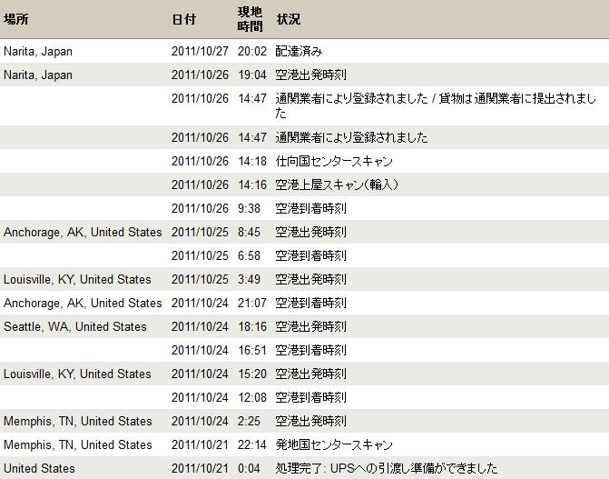 今回、アメリカからのファーストクラスメールを初追跡正規の追跡番号ではないけれど、税関告知書(CN22)についているバーコードの下のLCから始まる番号を発送時に教えてくれていたので空港に着くまでは追跡できた。Processed through Sort Facility September 26, 2011, 2:25 pm JAMAICA, NY 11430Processed through Sort Facility September 20, 2011, 8:41 pm BETHPAGE, NY 11714Acceptance September 20, 2011, 1:18 pm ASTORIA, NY 11102LGA近くの郵便局で投函して、30Km離れた郵便局に集荷され、JFKから出国と…元の郵便局からJFKまでだって15Kmなのにずいぶん遠回りだこと。ファーストクラスメールがいつも時間がかかるのはこういうわけなのね。アメリカが広いのと、飛行機搭載の優先順位が低いせいだと思ってた。この程度の距離がこんなにかかってたなんて配達は16時頃だったから、日本で通関されたその日に配達しにきてくれたのだと思うけどいくら郵便受けに入らない厚さだからって持って帰らなくても… > 宅配ボックスに入れてくれればいいのにね。