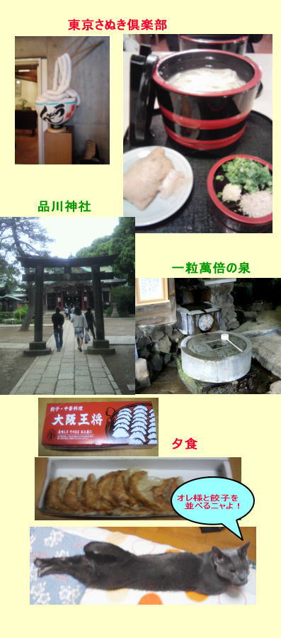 今日は、麻布十番の「東京さぬき倶楽部」で釜揚げうどんをいただきましたつるつるしこしこで、美味しいんですそして、「品川神社」でお参りしました。 レオンへのお土産は餃子・・・の、わけないか にほんブログ村猫ブログランキング参加しています。ぽちっとお願いニャン(=^・^=)