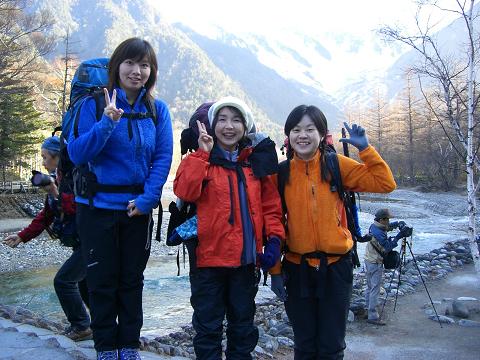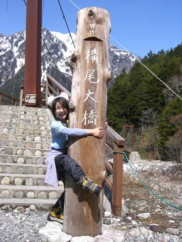 今回は2月に赤岳天望荘主催のピヨピヨ隊でご一緒したのりぴーとonoちゃんが最終あずさに乗り我が家に1泊するところから始まる涸沢カール&北穂高の旅です。11時33分下諏訪到着のお二人を乗せた私は1h前には松本で母とフジコ・ヘミングのコンサートに酔いしれていた。その余韻が消えぬまま、気分は北アルプスである。我が家で3時迄仮眠をとり3時半に出発だ!1時間少ししか寝れていない。今度から登山前日にはコンサートには行かないぞと思った位ちょっと辛かった。いつもなら1時間で沢渡Pだが・・・ノロノロ運転の県外車のお陰で朝早くから自然渋滞だ。何台かは避けてくれました。ありがとう!すいませんね。あおってるわけではないのですが・・・カーブでブレーキはなるべく踏まない運転に慣れてしまってるだけなんです。1時間半かかってPに到着!!タクシーに乗り上高地へレッツゴー!!!4月から¥500値上がりして¥4,000でした。途中、大正池に映る穂高連峰の美しさに感動の私達だ。河童橋でルンルン!明神にて。かず君も一緒です。徳沢にて。かなり朝っぱらからハイテンションだ!わ~!綺麗!もう睡眠不足なんて吹っ飛んでる!横尾大橋。6時半にかっぱ橋を出発してウダウダ話しながら歩いて8時前には到着だ!此処で大撮影大会が始まった!続く。 明日は小川山に初クライミングです。今日の勉強会も眠くて辛かったのでおネムします。zzzZZZ