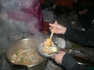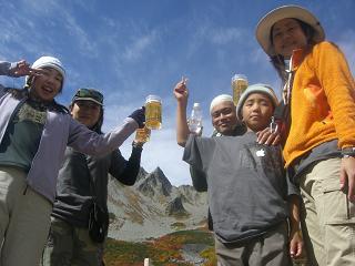 今回の涸沢紅葉探検隊はアップル登山部隊9名&顧問1名グビグビ隊(結成ホヤホヤ)&kouki総勢15名のパーテイーでの行動でした。男子4名はテント設営の為走って涸沢へ~~♪美人女子部隊は優雅にテクテクと歩きます。 途中でマイク真木とすれ違うが先を行く乙女達は気付かない・・・やはり唯一の40代の私しか知らないのか・・・ま、いいや~こんなとこで彼等も声を掛けられたら嫌だろうなと思い挨拶だけしてスルーした。先を行く若者の中に混じっていた30代前半のお姉様に「今、マイク真木とすれ違ったよね。」と言うと・・・「キャー!!」だとさ・・え?ご存知でしたか?(アラ、失礼・・・)するとマイク真木さんがニコニコして「写真撮りますか?」そう言われて断るわけもいかず「ハイ!ポーズ!」 「どちらから来られましたか?」の問いに「神戸からエッチラ来ました~」気さくな方でした。 20代の女性達は真木蔵人の父親だと言ったらわかってくれました。笑 本谷橋では、まゆぞうお手製のベーコンサンドイッチを頂きました。まいう~~♪もう皆早くビール飲みたいモードに切り替わります~~笑テクテク歩くと~~もう溜め息しか出ない絶景の連続です!! 3週間前は緑生い茂っていた登山道は色鮮やかに彩られています。やっぱり同じ場所に四季折々訪れると感激もひとしおです。ヒュッテ近いよ~~涸沢小屋への分岐点涸沢ヒュッテは混み込みだ~~おのちゃんと♪テント設営します~~あまりの大きさに見物の方々が押し寄せます。ひとつのテントは炊事場件男子睡眠スペース。もうひとつは女子専用スペース。贅沢過ぎます。 お待たせしました。宴会です。今回は山とは思えない超豪華デイナーでした。家庭用カセットコンロに大きなお鍋でパスタとキムチ鍋を作りました。 気付いたら・・・30人近い大宴会が繰り広げられていたのです。 翌日は早いので飲むより食べる事に集中する私でした。 そこで付けられたあだ名がギャル曽根にあやかりギャル美都・・・アレ?ギャルかい?ま、気にしないで~ 私の食べっぷりに圧倒される皆さんなのでした。あ、勿論・・・ちょっとは飲んでますよ~ちょっとね~~♪笑