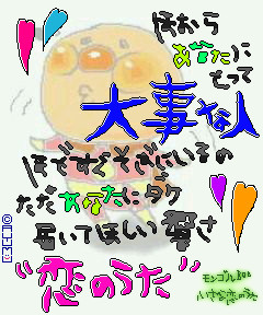 明日カラ、強化練習ということで合宿があります!!2泊3日の合宿がんばってきます^^大変だと思うけど、楽しいこともあるので楽しんできます!!あと、こうちゃんが明日野球の試合あるんですがでるっぽいデス^^がんばって!! こうちゃんそれでわまた ☆最近気になってるアーティスト☆ 最近MONGOL800が気になってます^^ あのプロポーズ大作戦でも出た『小さな恋のうた』 ですよ 皆さん聞いてみてください♪