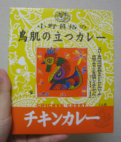 10/7の日記で見つけたと書いた「鳥肌の立つカレー」。先日スーパーにて商品を目の前にしてメンチの切り合いをし、見事負けたので購入してきました。中身はこんな感じ。さて、本当に鳥肌が立つのか、我が身を挺して実験です。パウチを熱湯で5分温め、封を開けるとチキンカレーのスパイシーな香り。ご飯に開けるときれいな鬱金色。ではいっただっきまーす…もぐもぐ…ん?なんか辛い…辛いよ。辛いって。うはー辛い!いつも甘口寄りの中辛しか食べない私にはこの辛さはまさに「辛」レベル。なんか別の意味で鳥肌立ってきた。なんか頭痛もしてきた。具で入っている鶏肉は味が沁みていてとっても美味しい。でも辛いー!勝ち負けで言うところの、試合に負けて勝負で負けた感じでした。完敗。“ライス付”鳥肌の立つチキンカレー・キーマカレーお試しセット鳥肌の立つカレー Aセット