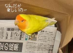 たくさんのコザクラさんがそうであるように、桃ちゃん@コザクラも新聞紙や広告などの紙をぱりぱりかじるのが大好きです。最近は古新聞を入れておく整理袋(新聞屋さんがくれる物)のふちをかじるのが気に入っているようで、今日はその袋のふちに停まろうとしたらバランスを崩して袋の底にぽとん!てっきり「わーん!」と飛び出してくるのかと思っていたら、なにやら袋の中でゴソゴソしているのでそーっと覗いてみたら…中を歩き回って、まったりして、なんだか楽しそう。1時間ほどそのまんま遊んでいてもらいました