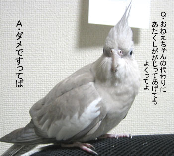 キミちゃん@セキセイは今までの無視っぷりはどこへやら、かじりーずにむんずと足を掛けたかと思うとガリガリと音を立ててかじり始め、ものの数分でCの字にしてしまいました。…という夢を見ました。現実はまったく全然進展なしです。すみません。そしてカフェ@オカメからこんなメッセージが。