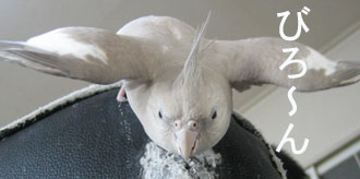 暑い!そんな中、今日はキミちゃん@セキセイと桃太@オカメを健診と爪切りのため病院に連れて行きました。行きの車の中は蒸し蒸し状態で、暑がりのキミちゃんはキャリー代わりのプラケースの中で翼を浮かせて「暑いわよー」のポーズ。病院に着いてもしばらくは息も荒く、先生にお水を出していただいたりしました。桃太は爪以外に鼻も掘り掘りしてもらってスッキリ!今回もまた大きなゴミを鼻の奥に隠し持っていました。本当はハルちゃん@セキセイも連れてきたかったのですが、彼女は当分先になりそうです。写真はパソコン前の椅子の背で翼を広げて縄張りアピールのカフェ@オカメ。(下からのあおりで撮ってます)大きな穴は勿論彼女が開けました