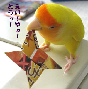 ふと思い立って、いらない広告を折って手裏剣を作ってみました。たいていのモノには驚かない桃ちゃん@コザクラにハイ、と渡したらぱくっとくわえてブンブン振り回し、挙句にポイ!見事じゃ、黄影!