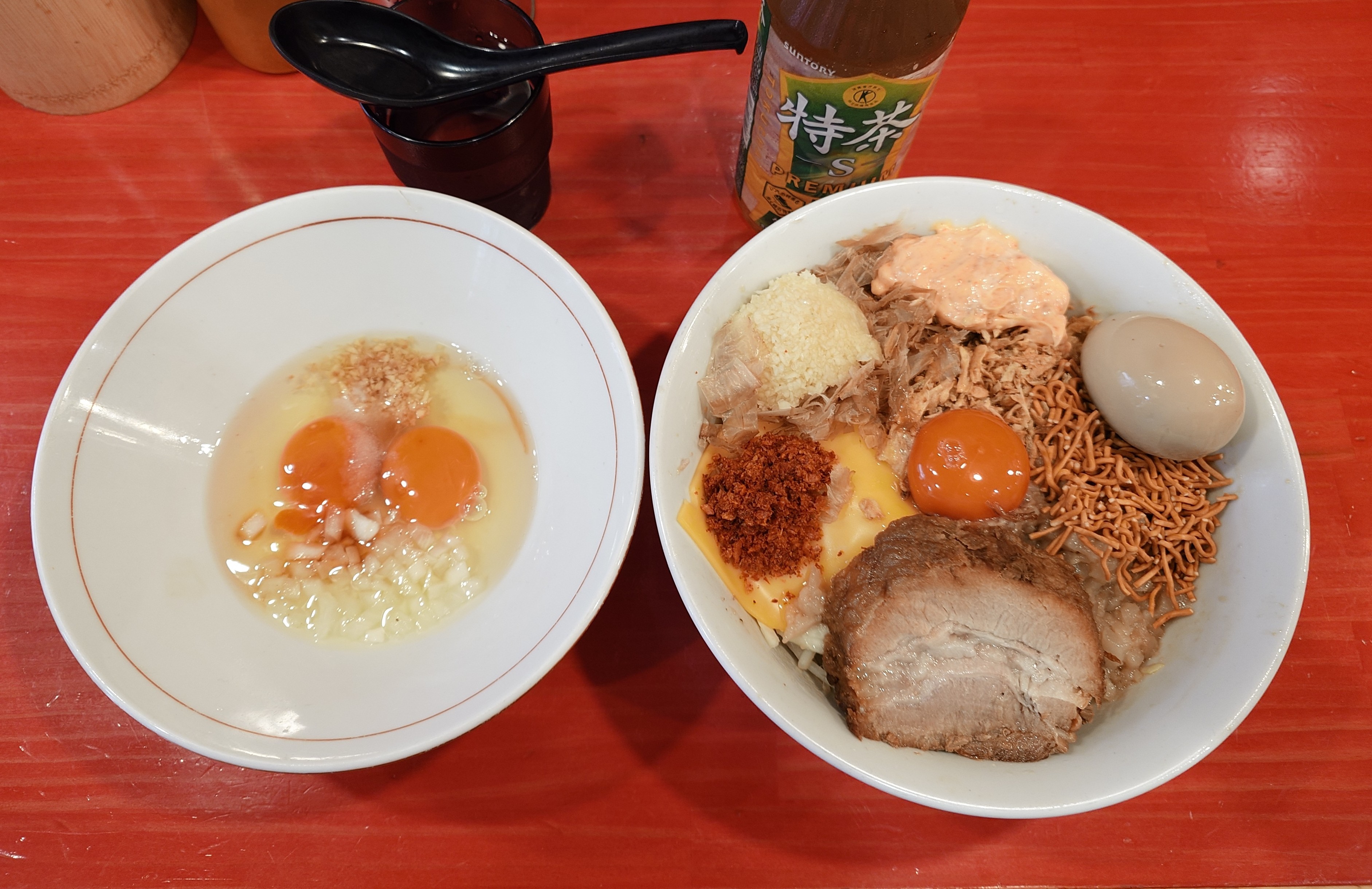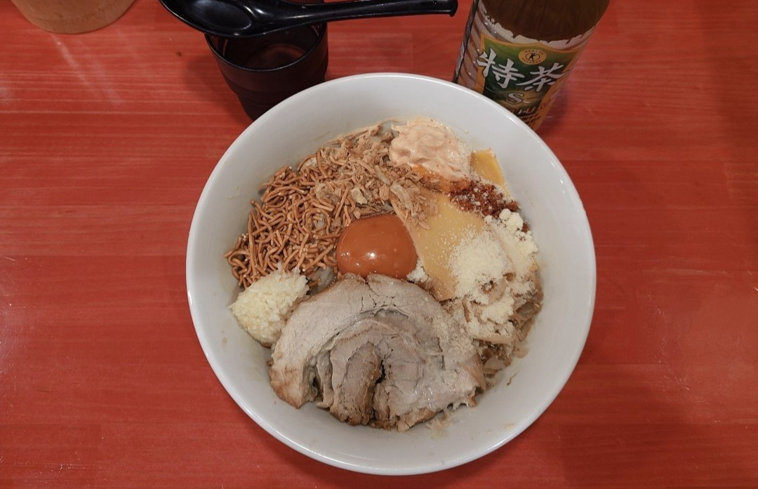 🕋ラーメン鷹の目 獨協大学前本店〒340-0011埼玉県草加市栄町2-9-12🟨ハイマウント(限定)(3→2)+味玉🟨コッコマン(🐣+🐣+🧅+🫚)🗣️全マシ今月の鷹の目の限定は全店で「🟨ハイマウントまぜそば」デフォルトは300g、50gずつ減らせる。(私は大食いじゃないので200gにしてます)麺マシは「100円券」を購入→麺マシで🆗店頭の自販機は、店内に持ち込み可特茶、黒烏龍茶がオススメ😋↑ハイマウントまぜそば(限定)(3→2)まず鷹豚を海老マヨで堪能😋ベビースターと鷹麺絡ませると食感が良い😋鷹の目のまぜそばよりカエシが濃くないトッピングの味が絡んだ複雑な味を堪能😋(卓上のカエシを少し使っても良いかも)これ食べると鷹の目の魚粉が懐かしく感じ、ハイマウント→鷹の目デフォルトまぜそば、交互に食べたくなる感じ😋デフォルトトッピング豚1枚、野菜(少し)、ベビースター、フライドオニオン花鰹、スライスチーズ1枚、卵黄無料トッピングニンニク、アブラ、エビマヨ、辛味有料トッピング味玉↑スライスチーズは溶けた方が美味しい😋大つけ麺博(新宿)のとろ~りチーズが欲しいとこ😋 ↑コッコマンコッコマンは元々ハイマウントのメニュー(十六代真っ赤卵×2+玉ねぎ+生姜)↑無料トッピング、参考にして下さい。↑建物外観最後まで読んでいただき、ありがとうございました。退店して、しばらくして雨が降ってきました😅 #ラーメン鷹の目#鷹の目#獨協大学前本店#本店#ハイマウント#ハイマ#限定#5月限定#まぜそば#二郎系#二郎系インスパイア#獨協大学#獨協大学前#草加松原#松原団地