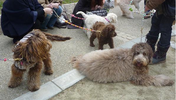 ボブが家族になってもうすぐ5年かな~そんな時は、散歩中に~おでかけの時に~ラブラドゥードルに出会うことがなくてなんだかさびしいワンと数年が過ぎ・・。ウツボ公園で、ルカちゃんとばったりビスキーままからのメールで犬友にモコちゃんが散歩しているところにばったりと、いつの間にやらラブラドゥードル仲間がふえていったので念願の関西初オフ会になりました(勝手に関西初オフ会と名乗ってます)オーストラリアン ラブラドゥードル堀江公園に集合ルカちゃんとモコちゃん「ルカの小さい時にモコちゃんがそっくりです」とルカパパルカちゃんとビスキーちゃんビスキーちゃんとモコちゃんシュナウザーのメルモ君とルークまだ2月10日に来日ほやほやの~2010年11月27日生まれのバレンティナちゃん(カフェ)、ステラちゃん(クリーム)姉妹今はまだ3キロぐらいですが~スタンダードサイズになるそうですいきなりスタンダード2頭なんて~いいなぁ「ルカちゃんを偶然見かけて、一目ぼれラブラドゥードルの虜に」なってしまったそうなおっきくなるのが楽しみですねステラちゃん、おっとり慎重派~ まったりしていてかわいかったバレンティナちゃん、とってもパワフルに動いておてんばさんでした姉妹で、もう性格がちがうんですねモコちゃん(パーチメント/カフェ)スモールミディアム 2010.7.23生まれ7か月で11キロまだ大きくなるそうですとってもフレンドリーぬいぐるみビスキーちゃんですほわんほわんの綿菓子ヘアー、とっても足が長くてスタイル抜群ボブ(10.3キロ) ビスキーちゃん(9.3キロ)ともにミニチュアサイズ公園で少し遊んだ後に、ドックカフェへ店内を走り回って仲良く遊んでいるわんこ達でしたと・・・言いたいところなんですがボブは「うぅ~」と、とってもいい顔するので私に隔離されていましたお恥ずかしい・・。あっというまに時間が過ぎてしまい、楽しい時間でした今度会うときは、もっと大きくなっている子もいるのでまたまた、楽しみがふえました