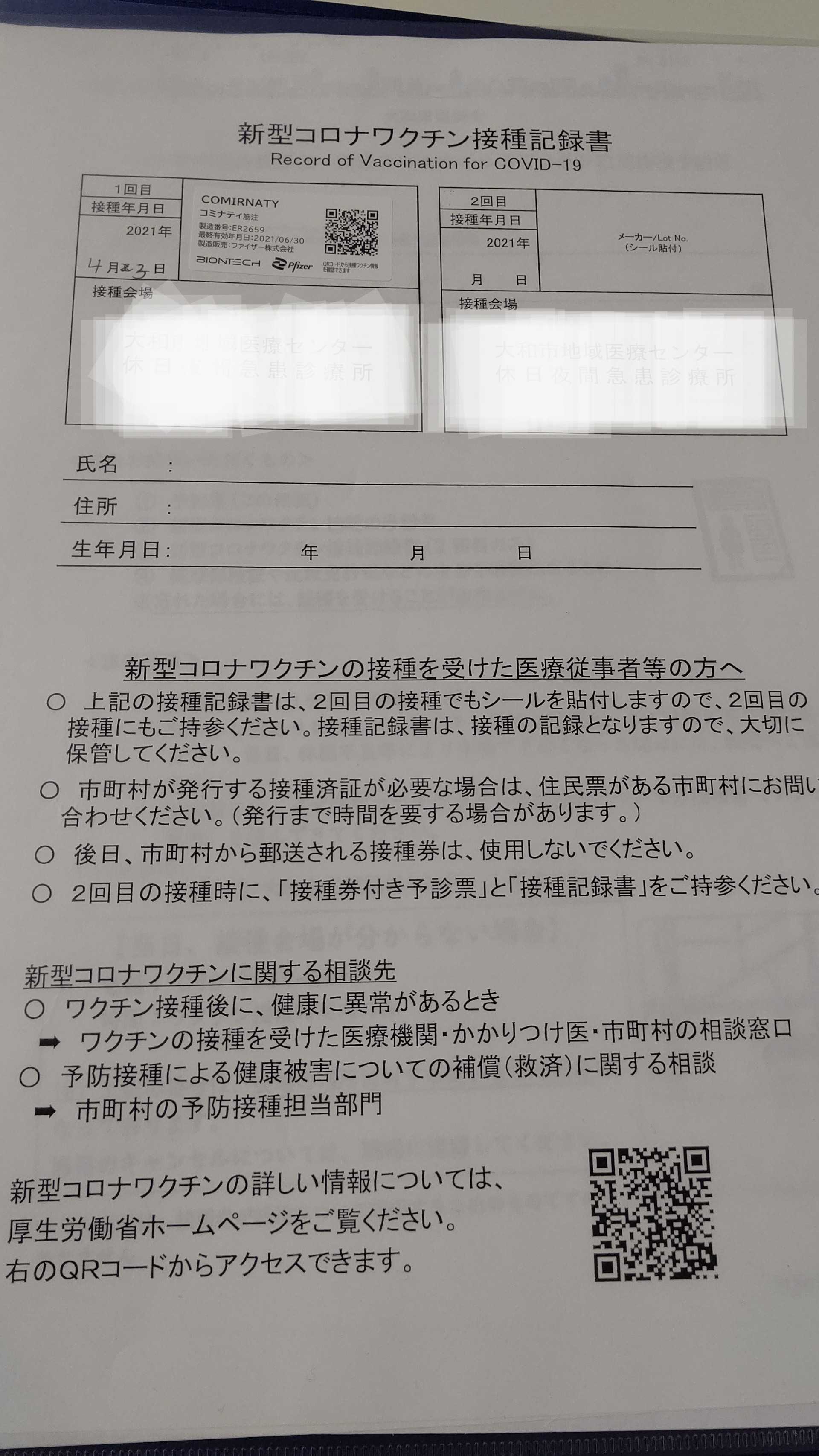 ちなみに2回目の予約は不要で3週間後に接種が予定になります
