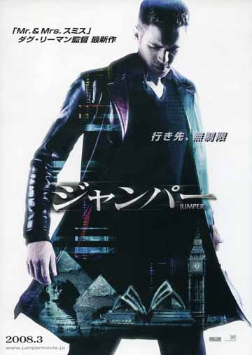 ジャンパー(JAMPER)試写会に行ってきました。ギリギリに着いたので、通路に座って観ることになってしまいました。でもさ、すっごい人だったんだよ!何人に招待状を出したんだぁ~~~!( ̄ロ ̄ノ)ノ面白そうだったので、結構楽しみにしてたんだけど、結果は、、、、ただのラブコメでした。(´ヘ`;)ハァ試写会でよかったよ!ヽ(ー_ー )ノ=====================================ミシガン州で育ったデヴィッド(ヘイデン・クリステンセン)は、同級生のミリー(レイチェル・ビルソン)に思いを寄せる、ごく普通の高校生だった。しかし、川で溺れそうになったとき、彼は自分に備わった途方もない“才能”に気づくことになる。冷たい川底から一瞬にして、図書館へと“ジャンプ”していたのだ!母が家を出て以来、人が変わってしまった父との生活にうんざりしていたデヴィッドは、1人ニューヨークへと向かった。15歳の彼が生きていくため次に瞬間移動したのは、銀行の金庫室だった。まんまと大金をせしめたデヴィッドだが、その存在に気づいた男がいた。“ジャンパー”を悪とみなし、彼らの抹殺を使命とする組織、“パラディン”のローランド(サミュエル・L・ジャクソン)である。10年後、デヴィッドはニューヨークからロンドンへ、オーストラリアの海へ、東京の繁華街へ、エジプトのスフィンクスへと飛び回り、“ジャンパー”の特権を謳歌していた。しかし、孤独だった。そんなとき、ミリーと再会を果たし、ローマでのデートに誘うデヴィッド。楽しいひとときを過ごした二人の前に、グリフィン(ジェイミー・ベル)という青年が現れる。彼もまた、“ジャンパー”の一人だったのだ。戸惑うデヴィッドは“パラディン”たちの襲撃に遭い、“ジャンパー”の宿命、そして母が秘めていた重大な秘密を知る…。