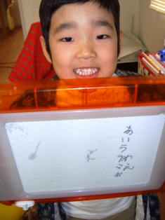 こんばんは。今日でブー太郎くんの春休みも終わり、明日からいよいよ新学期でス去年の今頃は、家の中で自分一人、と言うのが変な感じがしたものでスが、今はお待ちかね、あこ茶でス(´∀`)(と言っても火曜日が入園式ですぐお休みなのでスがね)暖かくて気持の良い日曜日、と言ってもダンナさんはお仕事、(あと少しで一段落するとは言っていたでス)まあそれで2人でゆるゆると過ごしていましたよう。あこ茶もまだ足が痛いでスしね、立ち上がる時に肩を貸してもらったりとか、洗濯物を取り込むのとか、100円ショップに行った際に荷物を持ってもらったりとか、(プラのコップとカゴ3つとブロックくらいなのでスが、「持つよ」と言ってくれたのでお願いしましたでス……)ブー太郎くんに色々手伝ってもらって、かなり助かりましたでス(´∀`)(写真はひらがな練習中のブー太郎くんでス)それから今日作ったのはこちら↓みかさんのリーン生地をベースに、全粒粉を加えて、バターの代わりにオリーブオイルを使って、この形状は多分初挑戦のバゲット、ダンナさんのお弁当のサンドイッチ用プチパン。美味しそうに焼きあがったのでスが、バゲットが何だかイメージしていたのと違う……。これはこれで美味しいのだけれども、粉もスーパーカメリヤ、それにバターの代わりにオリーブオイルを使ったせいか、結構ふっくらしちゃってるのでスよねん……。クープももうちょっと綺麗に入れられたら良かったでス……。次回はもうちょっと手間をかけて、せっかくリスドールも買ってある事でスし、久し振りに発酵生地を作って、おフランスなパン目指して頑張ってみようと思ったあこ茶でス。
