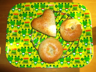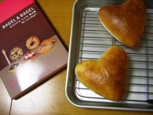 こんばんは。今日からゴールデンなウイーク突入でございまスね。我が家は大体カレンダー通り、今日はダンナさん出勤な上に、新人くんの歓迎会とやらで未だに帰って来やがりまへん……明日明後日はお休みなのでスが、特に何の予定も立てていないあこ茶家……。しかしブー太郎くんの奴が「ペンギンが見たい!」とか何とか言っていたので、名古屋港水族館にでも行ってみようかなあと思っているあこ茶でスさてさて。今日は昨日買った本を参考に早速お試しで作ったのが、ハートのベーグルでございまスこの成形、4/26の日記に書いたハートのソーセージと同じ要領でス。まだ試作なのと、温度設定と時間をうっかり間違えたせいで、ちょっち納得のいかない出来……何だか悔しいので、次回もっと愛らしくなるようリベンジでス!