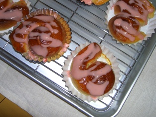 こんちわん。今日は雨が降ったりやんだりと不安定なお天気でございまス。ここのところ日曜日はおうちで休日らしい休日、ただいまZガンダム祭り開催中のあこ茶家でス。今日もまたちょっと目新しい成形をお試しでス。生地を四角くのばしてシナモンシュガーをふり、半分に折って切り分け、ねじって渦巻きにして作りましたでスよ。 仕上げにアイシングを2種類。パウダーシュガーに、1つはカラメルシロップを、もう1つは牛乳を混ぜて作ってまス。ちょっとつまむのにちょうど良い大きさ、小腹が空いた時にちまちまと食べちゃいまスよ(危険だ……)。ではでは、モウちょっとしたら選挙の投票に行って参りまス。投票率のアップ↑にささやか貢献(しているのかしらん?)あこ茶でス。
