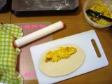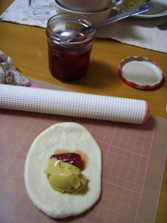 こんばんは。最近お昼過ぎから雨が降ると言うのが多くて、それで午前中ブー太郎くんが幼稚園に行っている間に原付に乗って出かけて用事をすませるのでスがね。そうすると晩ごはんやパンを作る時間がおしてきちゃうんでスよねん……。(出来れば午前中にある程度すませておきたいのでス)ブー太郎くんにもしわ寄せがきちゃいまスしね、モウちょっと上手く時間配分が出来れば良いのだけれど、何より早く午後保育にならないかなあと思うあこ茶でス……。今日はお昼ごはんを食べてからパン作り。ちなみにお昼ごはん、パスタにしようとブー太郎くんに言ったら、「トマトとエリンギのパスタがいい!」と、えらい具体的な組み合わせをリクエストされましたでス……。で、トマトとエリンギだけだと物足りなさそうだったので、これにツナを追加して、オリーブオイルとクレイジーソルトで炒めてソースを作り、からめて頂きましたよう……美味しかったス……自画自賛ス……。皆様明日のお昼のネタに詰まった際に是非どうぞ……エリンギがなければしめじやえのきでも良いし、ツナがなければベーコンやソーセージでも良いし、クレイジーソルトがなければ塩コショウでも良いのでス。要するに、あるもので作れば良いのデス……。……話がずれましたねん今日のパンは、みかさんのリッチ生地をベースに、クリームパンを作りましたでス……中に一昨日作ったいちごジャムのいちごを入れたのでスが、慎重にとじたにもかかわらず、二次発酵させていた際にシロップがしみ出てきましてね……焼きあがったら少し中身がはみ出ていたでス……(号泣)。だから写真をよーく見ると、はみ出た跡がありまス……それから、余った卵白で作ったのが、こちらの薄焼きクッキー。これはたかこさんのレシピなのでスが、ミオマーマさんがクリームパンを作った際に同じ事をしていたのを、あこ茶ナーイスアイディア!と思って、早速真似っこしたのでございまスが、チョコレートやら生クリームがなかったのでガナッシュクリームが作れなかったのと、焼いた際にえらい事くっついたのが多かったでス……。ちなみにくっついたブサイクちゃんは、今日のおやつになりましたでス写真は比較的まともに焼けたのを袋詰めにしておいたものでス。またもやささやかな見栄を張る(爆)あこ茶でス。