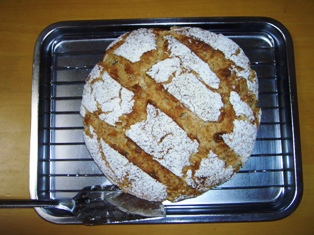 こんばんは。今日の晩ごはんの時の事でございまス。「あのさ、好き嫌いはあかんで」とブー太郎くん。「そうだね」とあこ茶。「後さ、お残しはいけませんよ」(食べる前に見ていた『忍たま乱太郎』が頭に残っていたようでス)「うんうん」「それから、食べ切ったらさ……おかわり!」……………………何故そうなる?「……食べ切ったら必ずおかわりする必要はないんじゃないかな?」「あか~ん!!!!!!!」……えらい勢いでブーイングでスよそれにしても、「食べ切ったらさ……おかわり!」……オチがついてまスわん……と思ったあこ茶でス……。さてさて。ここのところ連敗中のいちじくとくるみのパン。今日も懲りずに挑戦でスよ。今日はでスね、1つにまとめてカンパーニュにしましたでスよ。後、中種法なるものに初挑戦!水分量を調整して、こね上がった生地はばっちりそして焼きあがったのでスが……実は予熱待ちしている間に、クープからどんどん広がっちゃってでスね……えらい事ひび割れちゃってでスね……何だかちょっと平べったいような……?また失敗か?!と思いながら、少し切って食べてみたらば……………………美味~!見た目はとにかく美味!でしたよう!パン自体もでスが、いちじくのぷちぷちとクルミの食感が何とも言えず、ちょっとハマる味わい!ちょっとだけれど、成功に近づいたでスかね?そんな訳で(どう言う訳なんだか)、今度ちゃんと発酵かごを買おうと心に誓ったあこ茶でス。