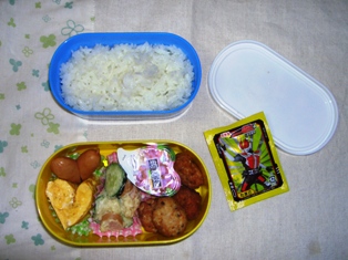 こんばんは。今日はブー太郎くんお弁当の日だったのでスよ。そんな訳で、いつもより10分早起きして作りましたでス。今日はハートの卵焼きとソーセージ、ポテトサラダ、チキンナゲット、こんにゃくゼリー、ふりかけごはん(ブー太郎くんが電王のふりかけを持って行きたかったからでス)、そして毎度お馴染みおまけパン。……結構な量だと思うのでスが、これを残さず食べてくるのでスよ。「今日も食べ切ったよ!美味しかったよ!」と、空っぽのお弁当箱を差し出すブー太郎くんでスそして今日のおまけパンは、新学期になって初めてのお弁当の日、ブー太郎くんのパンを「見せて~♪」と言うであろうチビ共のハートをがっちり掴む為、こちらのパンを作りましたよう見た目はコレこの通りのりんごちゃんでスが、中身は粒あんでございまス今回はカップを小さめにしたので、よりりんごらしく丸く愛らしくなったかと思いまス要するに、見た目が大事よあこ茶でス。