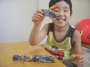 こんちわん。今日はブー太郎くんと楽しい工作だったのでスよ。幼稚園でもらった夏休みのカレンダー、工作したり、夏の思い出の絵を描いたり、写真を貼ったりして始業式の日に提出なもので、それでぽっかり時間が出来た今日、やった訳でスよ。写真は紙をちぎってお化けを作って貼るので、その前に紙を線に沿って切っているところをパチリ☆それから夏の思い出の絵はあこ茶の指導の下、花火をしているところを描いて、写真は親戚の家に遊びに行った際におもちゃを買ってもらってご機嫌なところと、ウチの母さんと一緒にごはんを作っているところのが良いと言うのでそれをプリントアウトして、観に行った仮面ライダー電王のチケットを貼って完成後は制服と制帽にアイロンをかければ新学期の準備はOK、あこ茶でス。今日のお昼ごはん、本当は即席ミートソースパスタにしようとソースを用意していて、さてパスタを茹でようとパスタを入れている容器を見たら……………………パスタがほとんどないじゃない~……久々にやってもうたじゃない~……パンは朝食べてしまったし、ピザを作るには時間がかかるし、ごはんはダンナさんのお弁当を作った時点でなくなったし……どうする?どうするあこ茶?と、悩みながら食材を入れている籠を発掘していたら、ホットケーキミックス発見!冷蔵庫にて昨日の晩ごはんの残りの春雨発見!(もともとお昼に食べようと思っていたのでスがね)これでお昼ごはんは何とかなるワンとホッとしましたようそしてホットケーキを焼くならば、例のものを早速使おうじゃないかと引っ張り出して使ったらば、これが素晴らしかったのでございまスよ~2人分のホットケーキを焼く為に出すのはどうかと思ったのでスが、フライパンで1枚1枚焼いていたら時間がかかってしまうと言う訳で使ったらば、ちびホットケーキが6枚いっぺんに、それも結構ムラなく綺麗に焼けて、何てワンダホウ!でございまスよそれで今度の日曜日はホットケーキで朝ごはん♪と思ったあこ茶でス♪